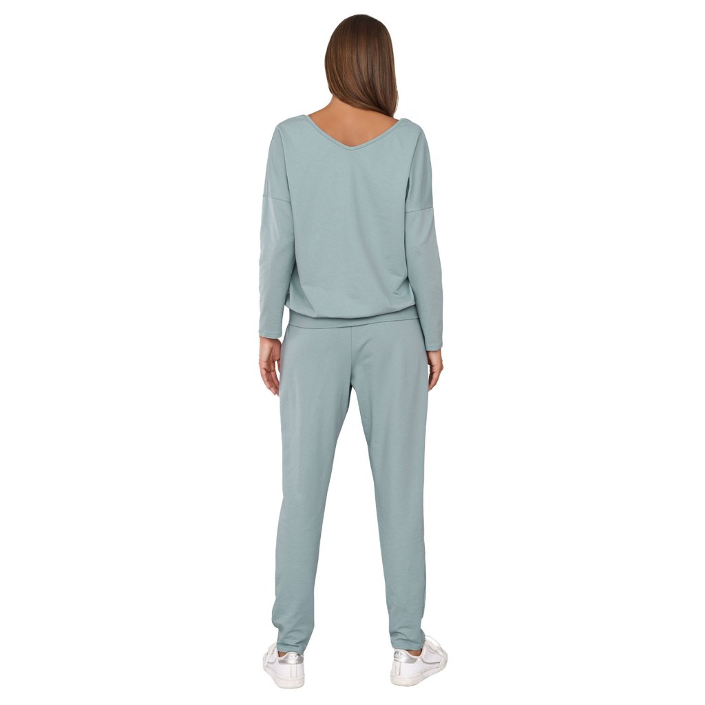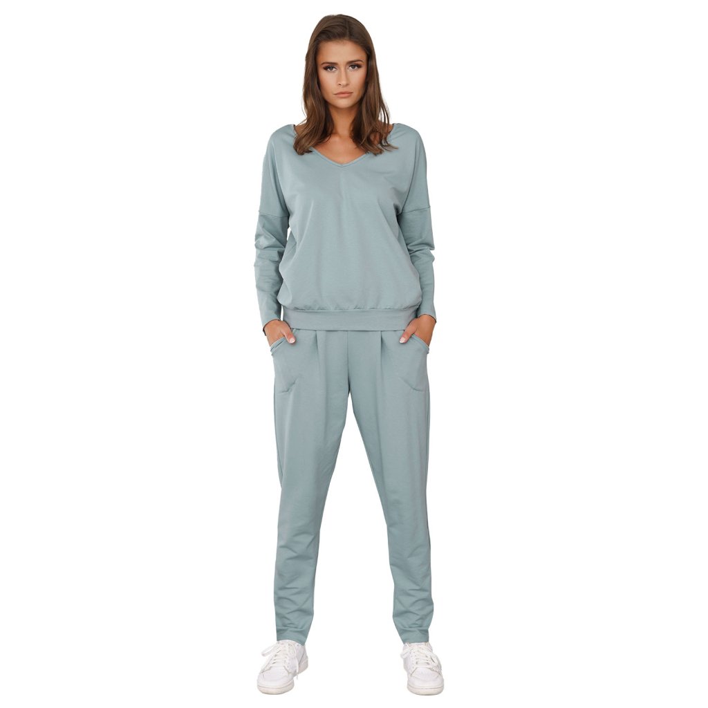 Sada s pohodlným střihem. Halenka s lícním výstřihem vpředu i vzadu a žebrovaným lemem. Kalhoty se záhyby, kapsami a širokým netlačícím pásem v tunelu.Materiál: 95% bavlna, 5% elastan.