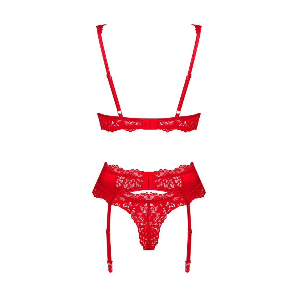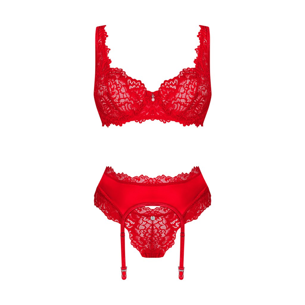 Třídílná sada Amor CherrisZrychlete tep srdce své drahé polovičky a vytvořte nesmírně vášnivou atmosféru. Oblečte si červené kalhotky, podprsenku a podvazkový pás, které byly navrženy s důrazem na detail. Ciťte se výjimečně a udělejte elektrizující dojem!Prozkoumejte další podrobnosti:Podvazkový pás, tanga a podprsenka.perfektně padnoucí díky vícestupňovému zapínání a nastavitelným ramínkůmkostice v košíčcích - odhalují poprsíkrajkové vsadky se zajímavým vzoremlesklý přívěsek - zajímavý detailelastická tkanina - poskytuje mimořádné pohodlíMateriálové složení:podprsenka a tanga: 90 % polyamid, 10 % elastanpodvazkový pás: Materiál: 95% polyamid, 5% elastanDoplňkové parametry
