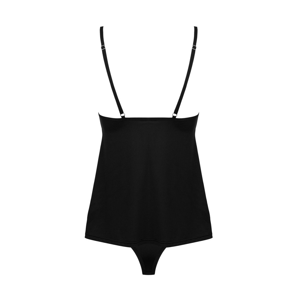 Top a kalhotky jsou vyrobené z přizpůsobivého materiálu polyamidu a elastanu. Mají elegantní černou barvu. Tílko má zdobený výstřih. Ramínka jsou nastavitelná. Top je dlouhý cca 60 cm. Kalhotky jsou brazilského střihu. Vepředu jsou tvořené vyšívanou krajkou. Set obdržíte v dárkové krabičce.Materiálové složení 85% polyamid, 15% elastan
