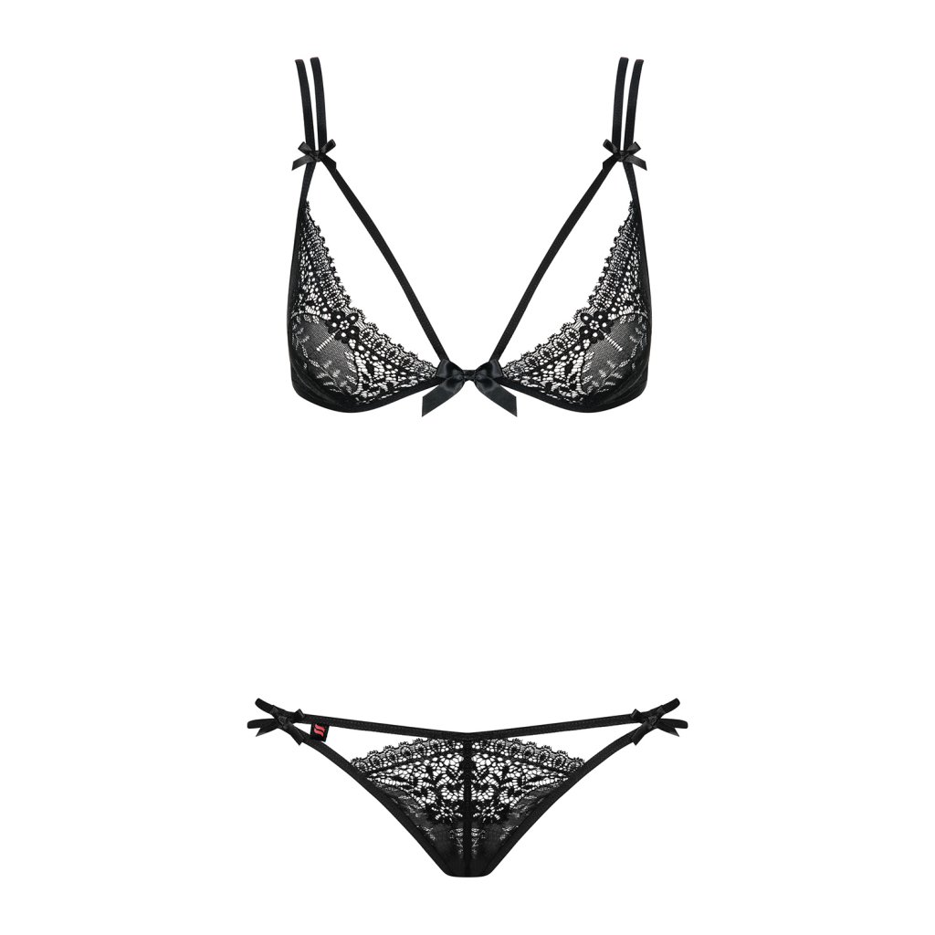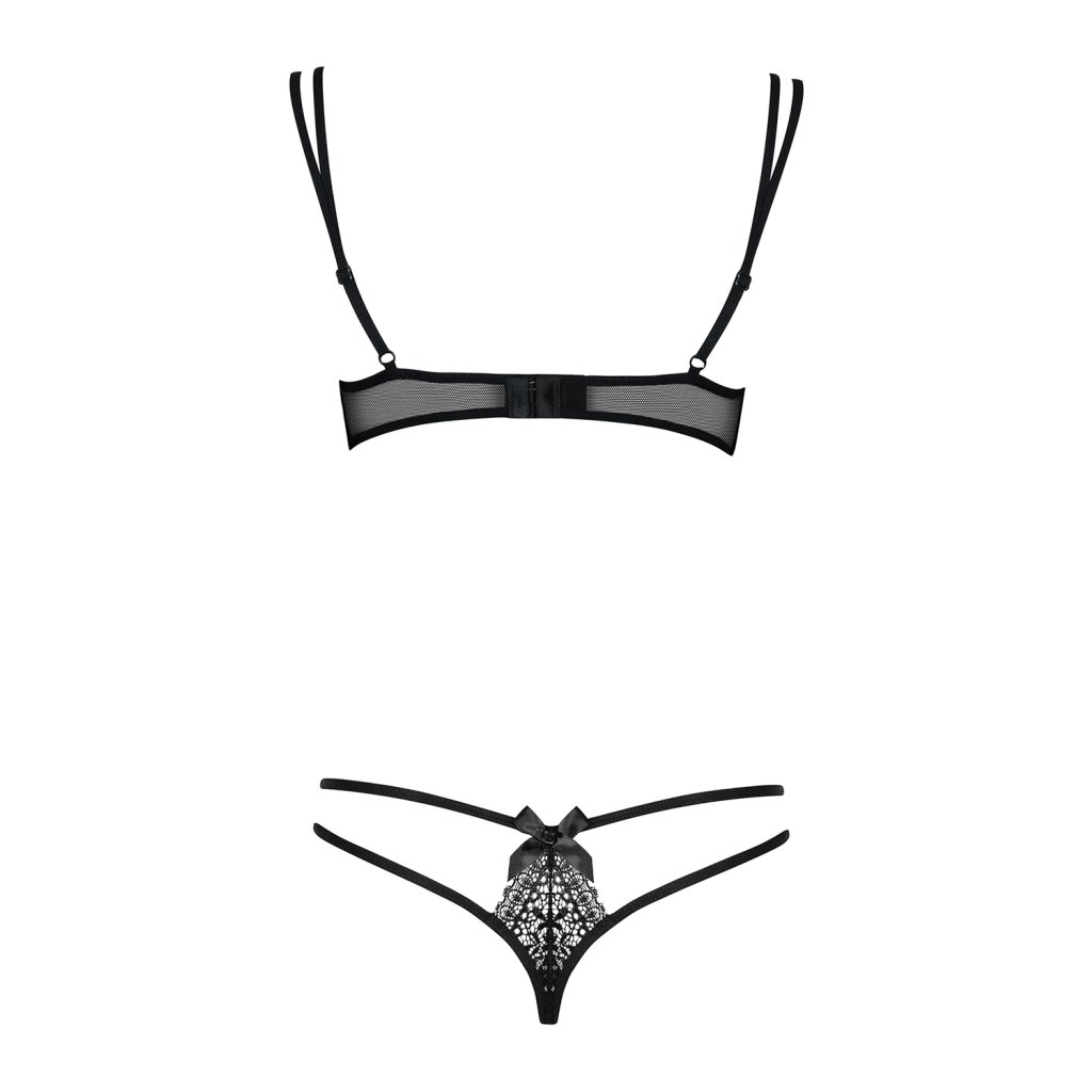 Svůdná dámská souprava Intensa set Obsessive v černé barvě.Dámská souprava je vyrobena z jemného průsvitného tylu v kombinaci s jemnou krajkou.Košíčky jsou měkké a vyrobené z elegantní krajky. Rafinovaně ušitá dvojitá ramínka jsou ozdobena mašličkami.Ramínka jsou délkově nastavitelná. V zadní části je tříbodové zapínání ve dvou řadách.Dámská souprava je vyrobena z průžného materiálu, který se přizpůsobí postavě.V sadě jsou sexy tanga, jejíž přední a zadní díl spojují dva elastické proužky.Doplňkové parametry