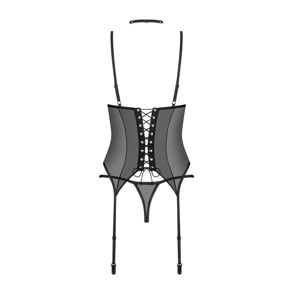 Sexy černý korzet. měkké košíčky nastavitelná ramínka bez zapínání vzadu lákavá kravata nastavitelná, neodnímatelná ramínka sada obsahuje tanga a choker tanga s tenkými ramínky souprava je vyrobena ze síťoviny a krajky Punčochy nejsou součástí Složení: Korzet: 94 % polyamid, 6 % elastan. Tanga: 90% polyamid, 10% elastan. Choker: 90% polyamid, 10% elastan.