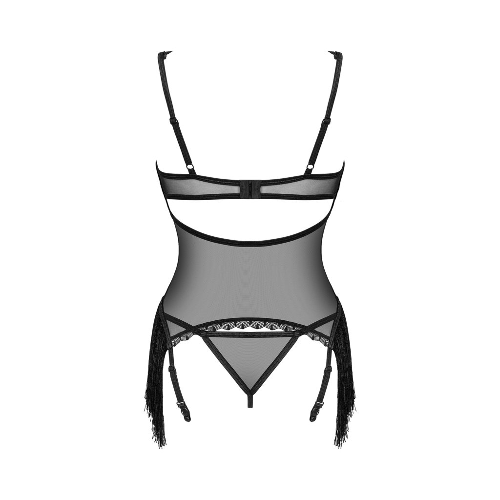 Neodolatelný na pohled, pro vaše maximální sebevědomí a nekonečné pokušení. Tento korzet nemá obdoby! Probouzí představivost a vyniká detaily, které mu dodávají dávku pikantnosti, podvazky, jemné střapce a minimalistické krajkové lemy. Delikátní průsvitný materiál těsně přilne k vašemu tělu s vynikající lehkostí. Oblečte si ho a oddejte si nezapomenutelné okamžiky. sexy černý korzet a tanga Sherila nastavitelná ramínka a podvazkové popruhy a vícestupňové zapínání – perfektní padnutí střapce na poprsí a bocích punčochy nejsou součástí luxusní a příjemné materiály pohodlné a příjemné na nošeníDoplňkové parametry
