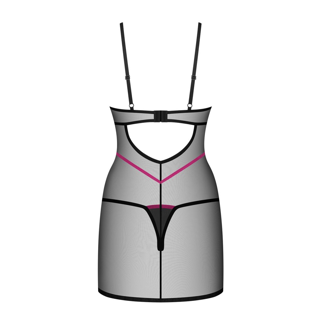 Sexy černá košilka . nastavitelná, neodepínatelná ramínka měkké košíčky zapínání na háček a očko vzadu vzadu hluboký výstřih vypasovaný střih ozdobné fialové pruhy výstřih zdobí lesklé zdobení s černými zirkony sada obsahuje tanga s tenkými ramínky košilka je vyrobena z elastické síťoviny Složení: 94% polyamid, 6% elastan.