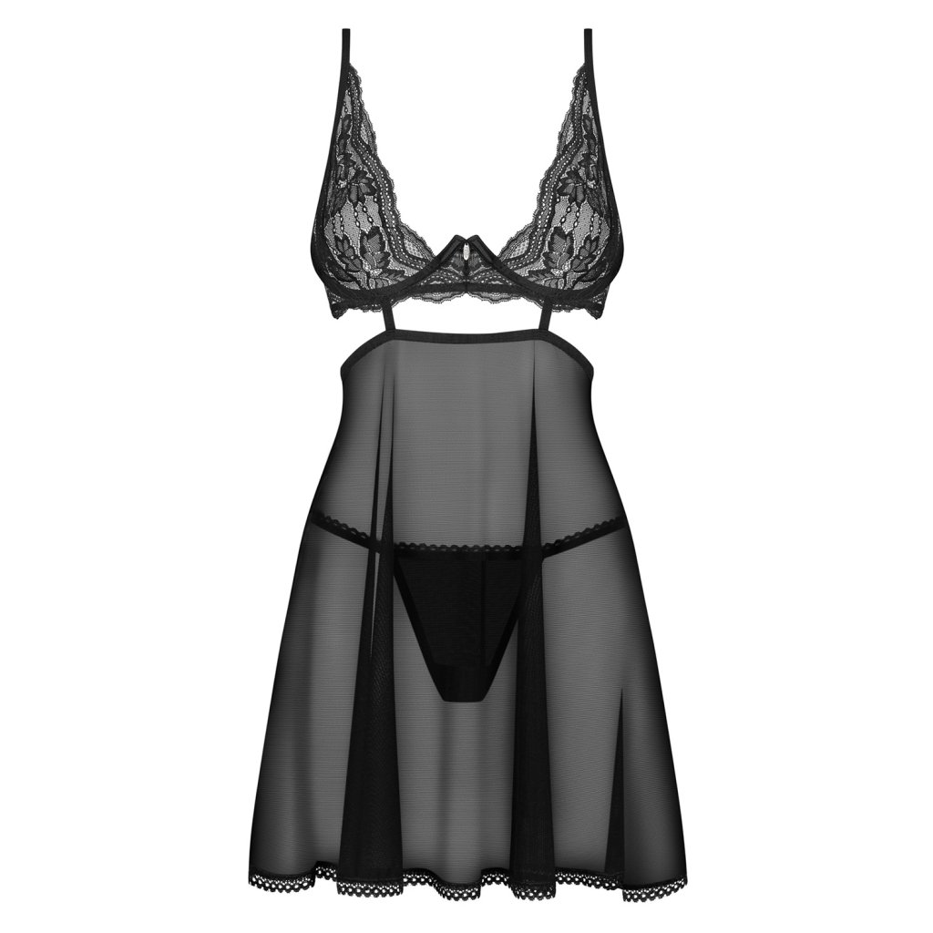 Oslavte svoji krásu v luxusním prádle! Pokud si vyberete tuto překrásnou košilku z kolekce Nutris od luxusní značky Obsessive, můžete se těšit na sofistikovanou a erotickou kombinaci hladkého průhledného materiálu a propracované krajky se strategicky umístěným průstřihem pod prsy. Nechte se hýčkat hebkostí a jemností látky, dejte najevo svoji svůdnost a maximalizujte své sebevědomí.- překrásná košilka a tanga