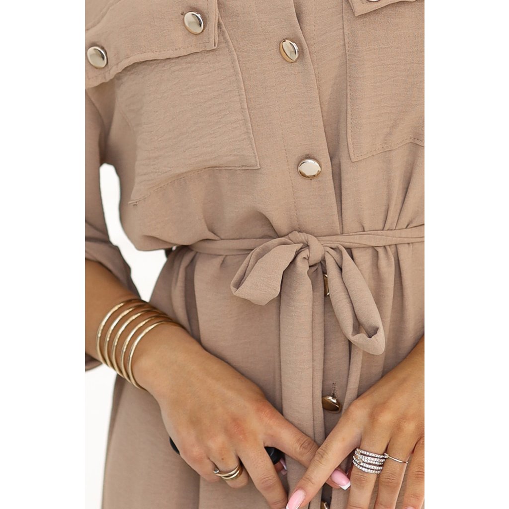 Košilové midi šaty se zlatými knoflíky a zavazováním - MOCHA MOUSSE 531-3