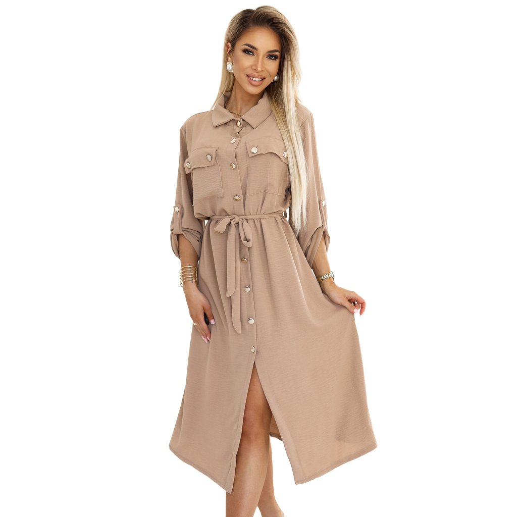 Košilové midi šaty v trendy mocha mousse barvě se zlatými knoflíky, zavazováním v pase a 3/4 rukávem. Elegantní design košile, ideální pro každou příležitost. Značka Numoco Basic.