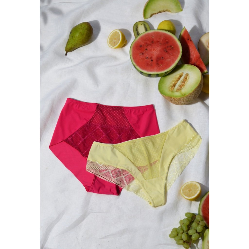 Oblíbené kalhotky brazilky jsou v kolekci Fruity Loop doplněny tylem a zdobené krajkou. Díky široké krajce na zadním díle se nezařezávají.