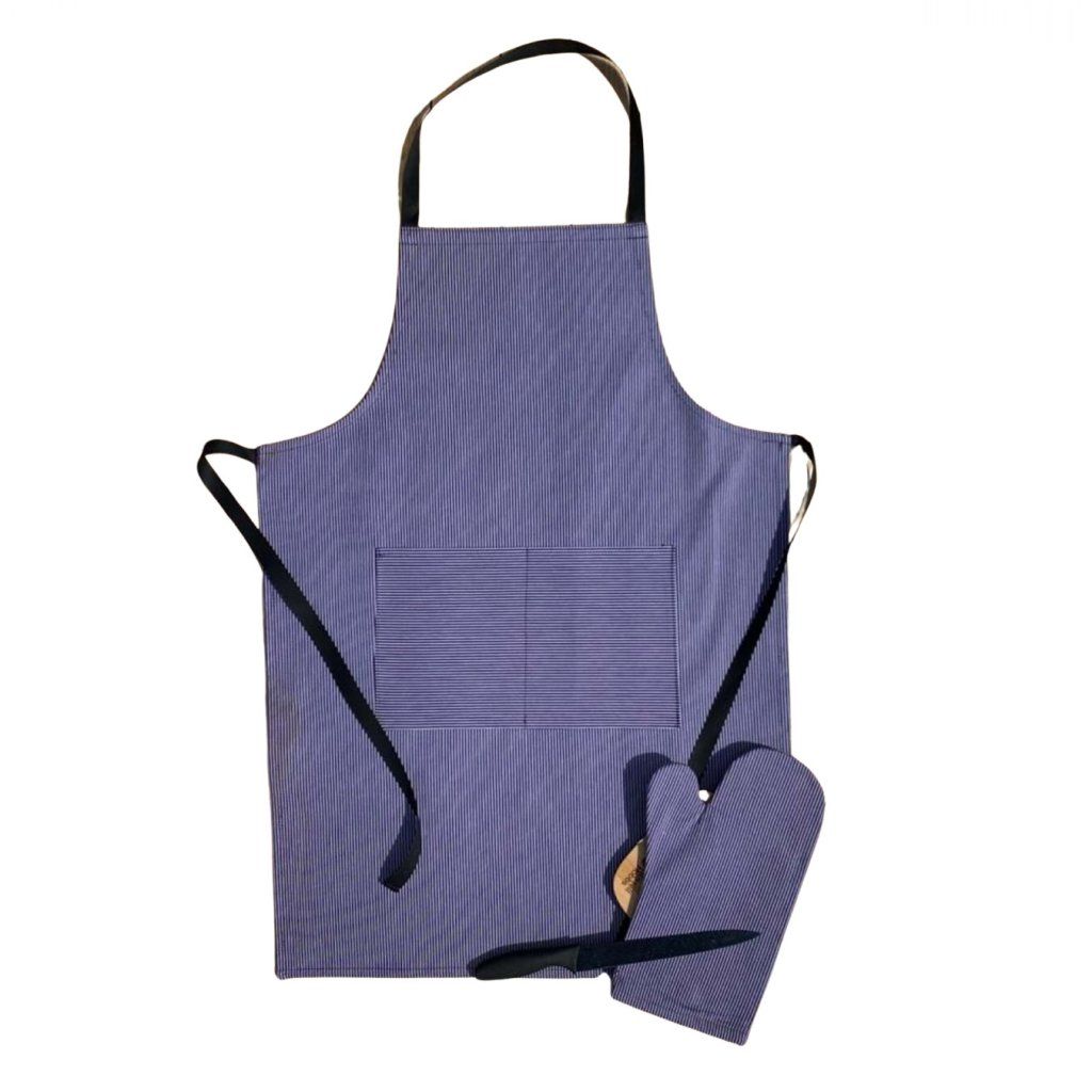 Zástěru s jemným modrým proužkem, vyrobenou z kvalitního a odolného materiálu. Je vybavena praktickými kapsami na přední straně pro uložení grilovacích nástrojů, koření nebo utěrky.