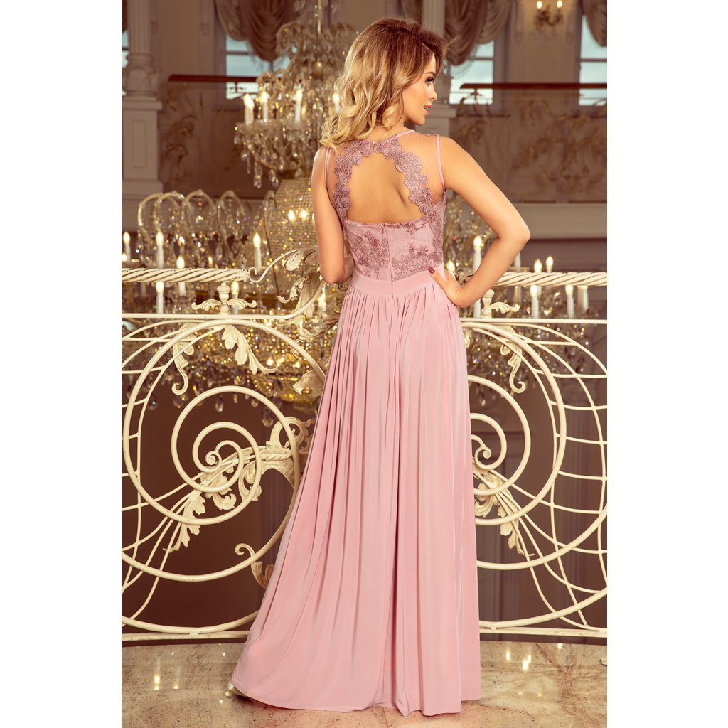 Dlouhé maxi šaty s vyšívaným výstřihem - TAUPE. Šaty překrásně odkryjí výstřih a záda. Polský výrobek. Značka numoco.