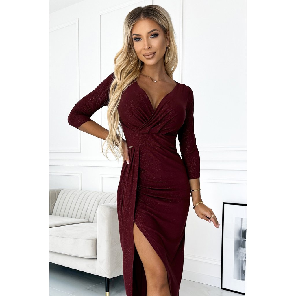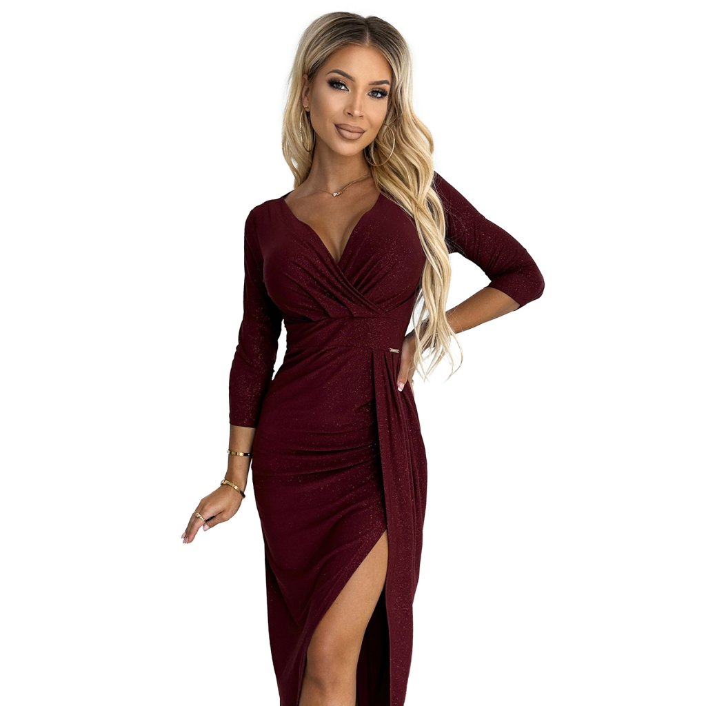 Lesklé šaty s psaníčkovým výstřihem a rozparkem na nohavici. Vyrobeno z elastického materiálu se třpytkami. Vínová barva. Značka Numoco. Polská výroba.