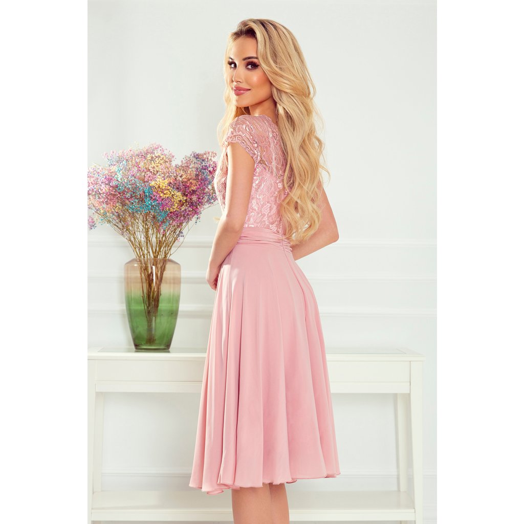 Linda - exkluzivní šifonové šaty s krátkým rukávem, krajkovým výstřihem a průstřihem na zádech - špinavě růžové. Polská výroba. Značka Numoco.