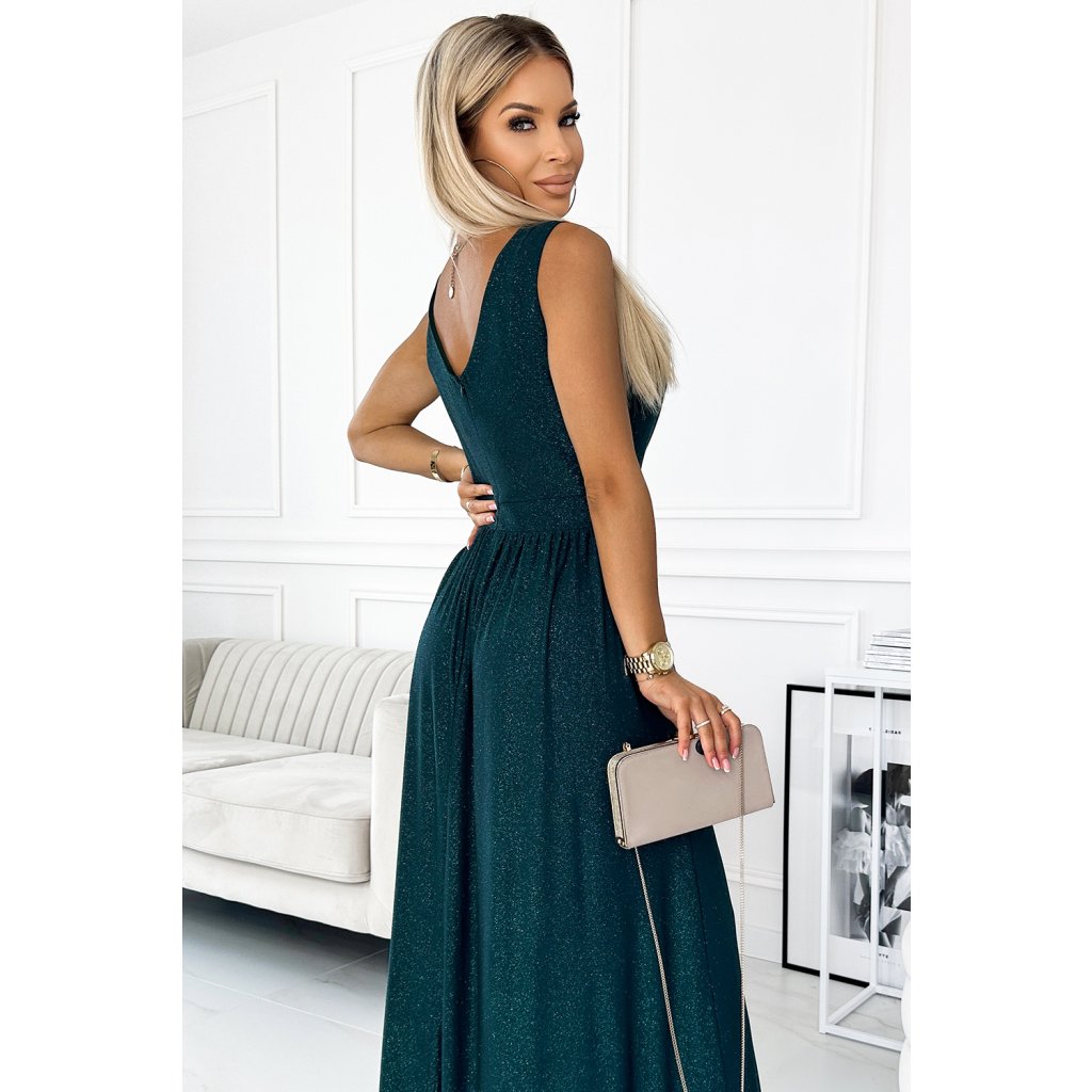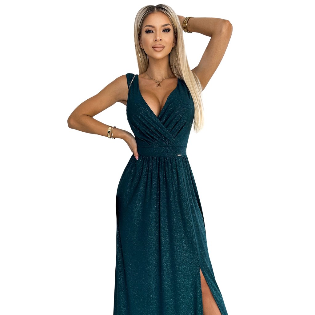 LOUISE - dlouhé brokátové maxi šaty s hlubokým výstřihem, širokými ramínky a rozparkem na nohavici. Barva: lahvově zelená se třpytkami. Šaty krásně odhalují dekolt a jsou skvělé pro tanec. Zapínání vzadu na skrytý zip. Polský výrobek. Značka Numoco.