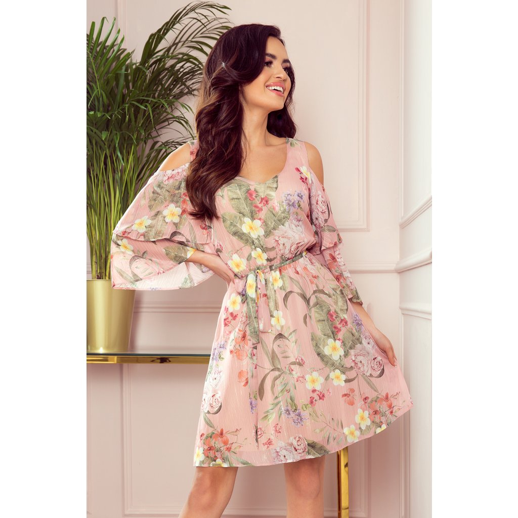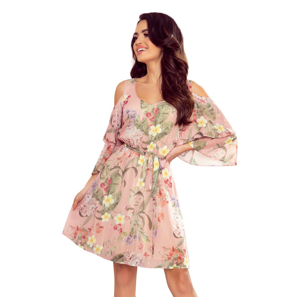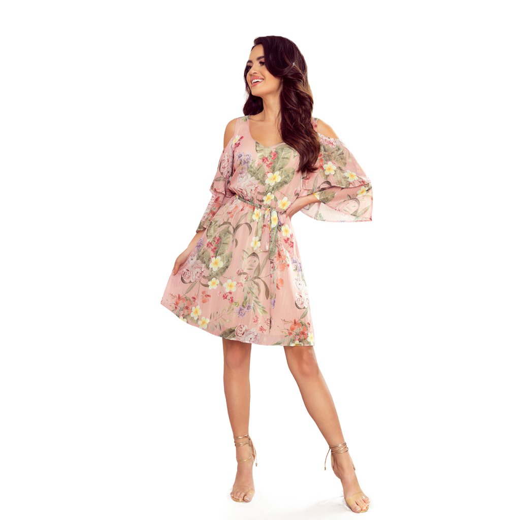Marina - šifónové šaty s rozšířenými dvojitými rukávy, výstřihem a elastickým pasem. Barva: pastelově růžová + květiny + stříbrná nit. Značka Numoco. Polská produkce.