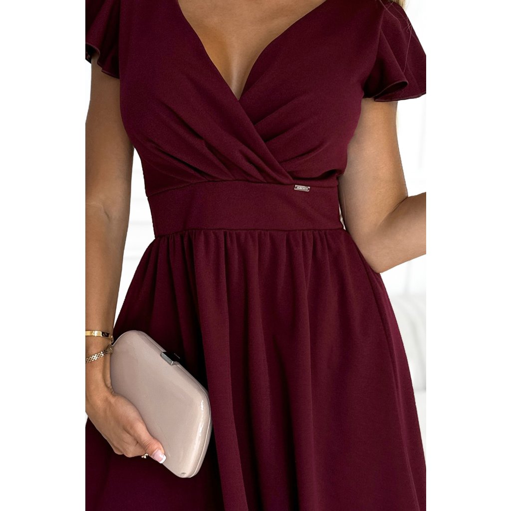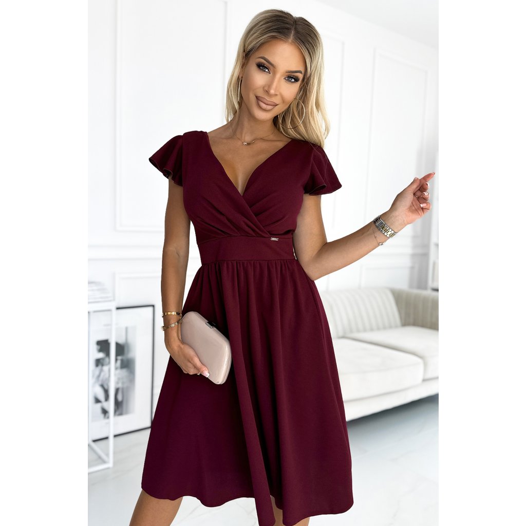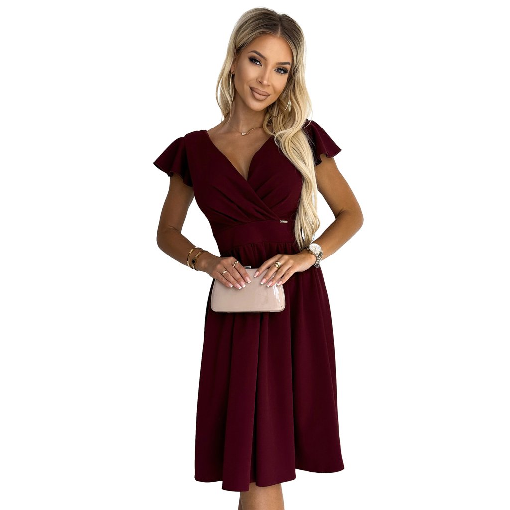 Matilde - rozevláté šaty s psaníčkovým výstřihem a krátkými rukávy. Z mírně elastického materiálu ve vínové barvě. Značka Numoco. Polský výrobek.