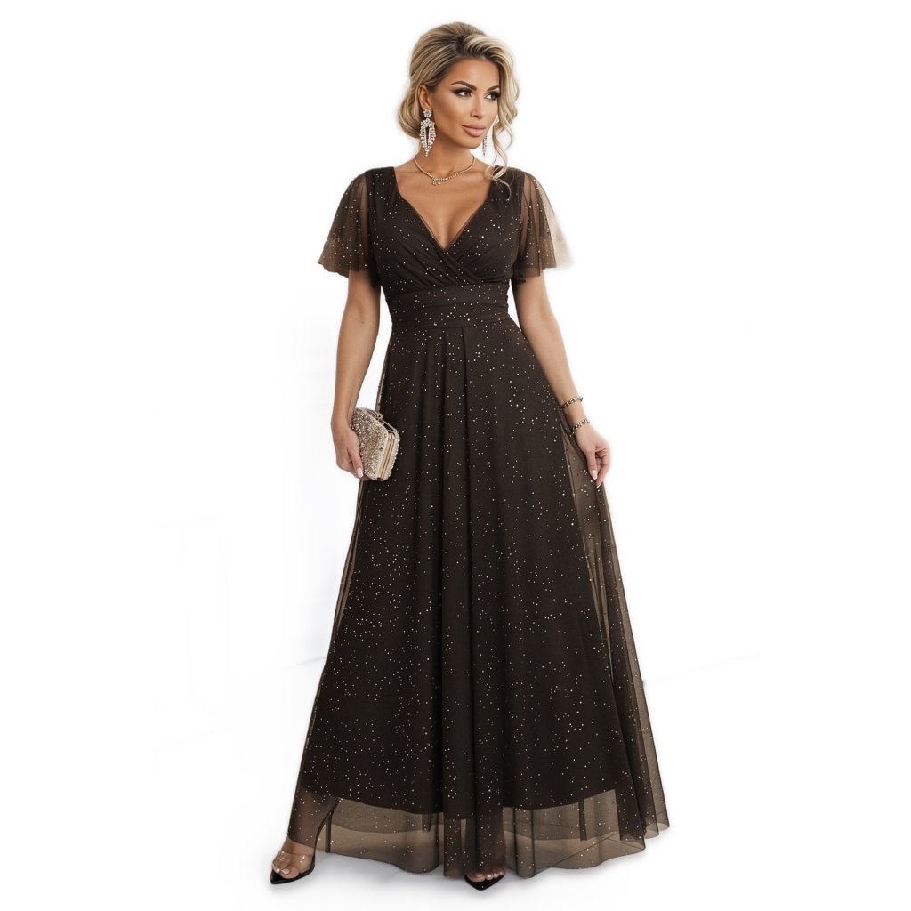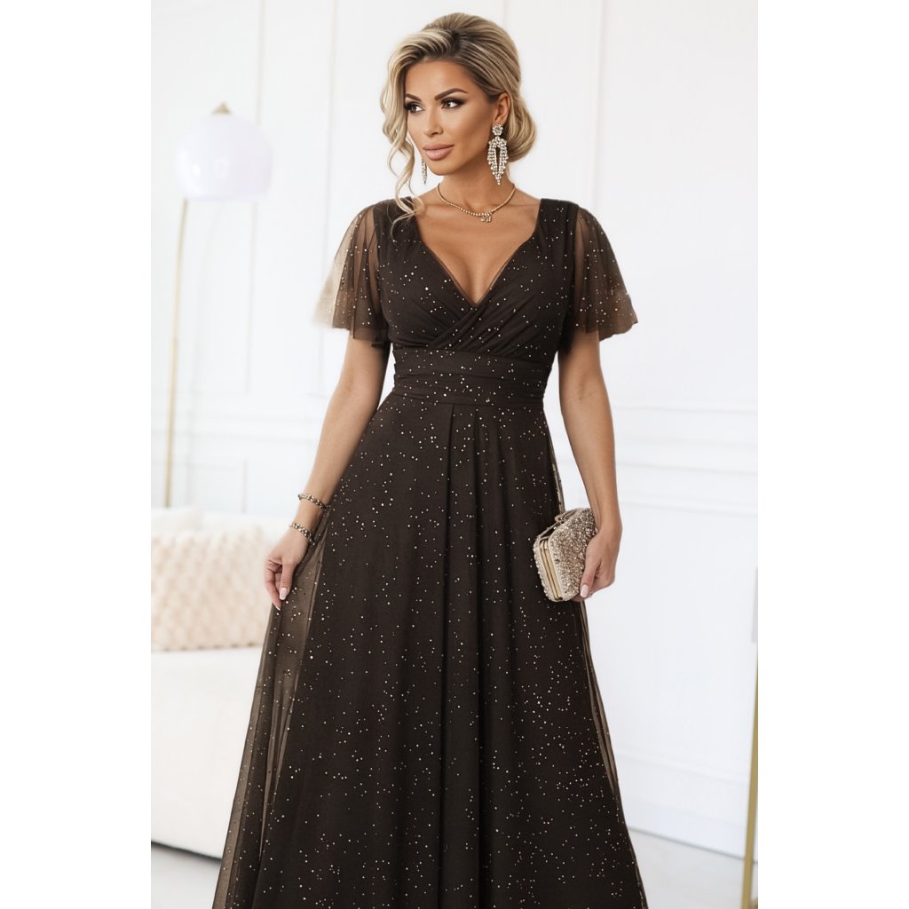 Elegantní dlouhé čokoládové šaty s třpytkami - Numoco Basic