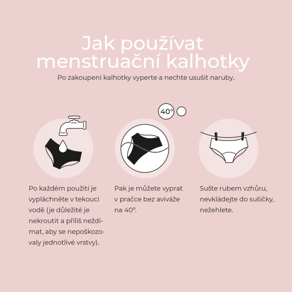 Po zakoupení kalhotky vyperte a nechte usušit naruby. Po každém použití je vypláchněte v tekoucí vodě (je důležité je nekroutit a příliš neždímat, aby se nepoškozovaly jednotlivé vrstvy). Pak je můžete vyprat v pračce bez aviváže na 40°. Sušte rubem vzhůru, nevkládejte do sušičky, nežehlete. Kalhotky mohou schnout o něco déle než ostatní prádlo, proto jich doporučujeme mít několik, aby bylo možné je během jedné menstruace pohodlně střídat.