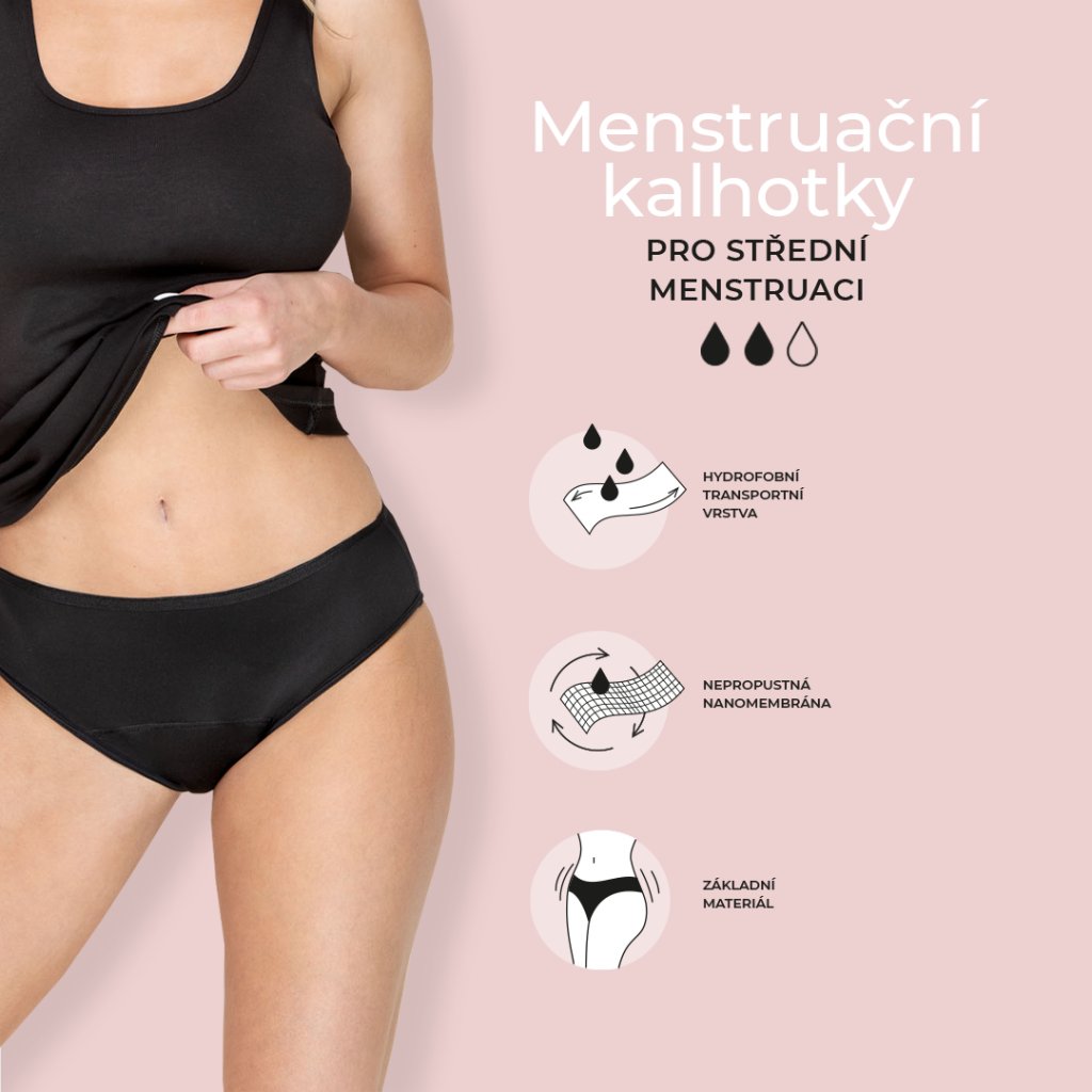 Menstruační kalhotky pro střední menstruaci se skládají ze tří vrstev: