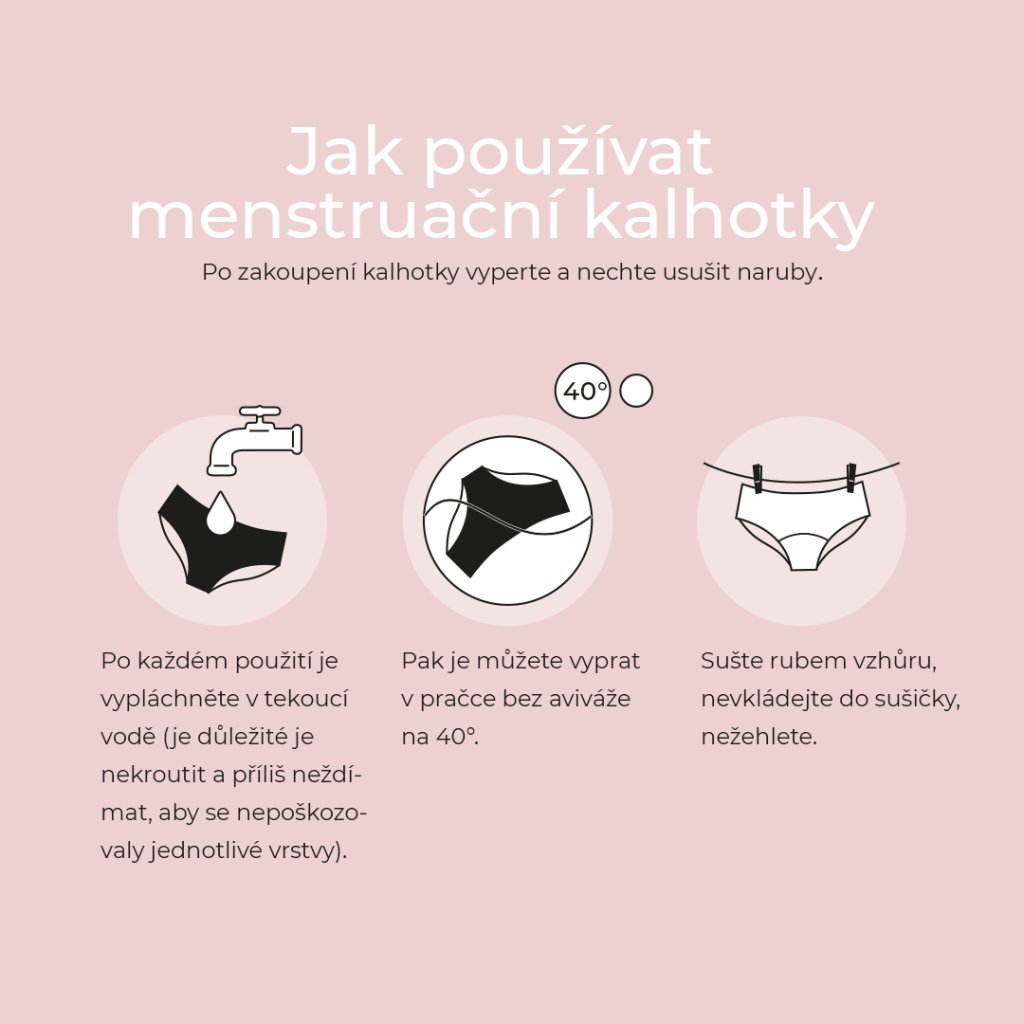 Po zakoupení kalhotky vyperte a nechte usušit naruby. Po každém použití je jemně opláchneme pod proudem studené vody (je důležité je nekroutit a příliš neždímat, aby se nepoškozovaly jednotlivé vrstvy). Pak vyprat v pračce bez aviváže na 40°. Sušte rubem vzhůru, nesušte v sušičce, nežehlete. Kalhotky schnou o něco delší dobu než běžné spodní prádlo. Doporučujeme mít více kusů, aby žena nebyla závislá než jí jedny uschnou.