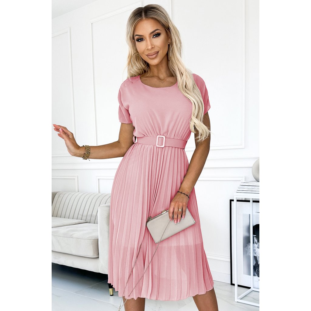 Plisované šaty MIA s kulatým výstřihem, širokým páskem a krátkými rukávy. Vyrobeno z šifonové látky s podšívkou. Barva: špinavě růžová. Perfektní šaty pro každou příležitost. Značka Numoco. evropská produkce.