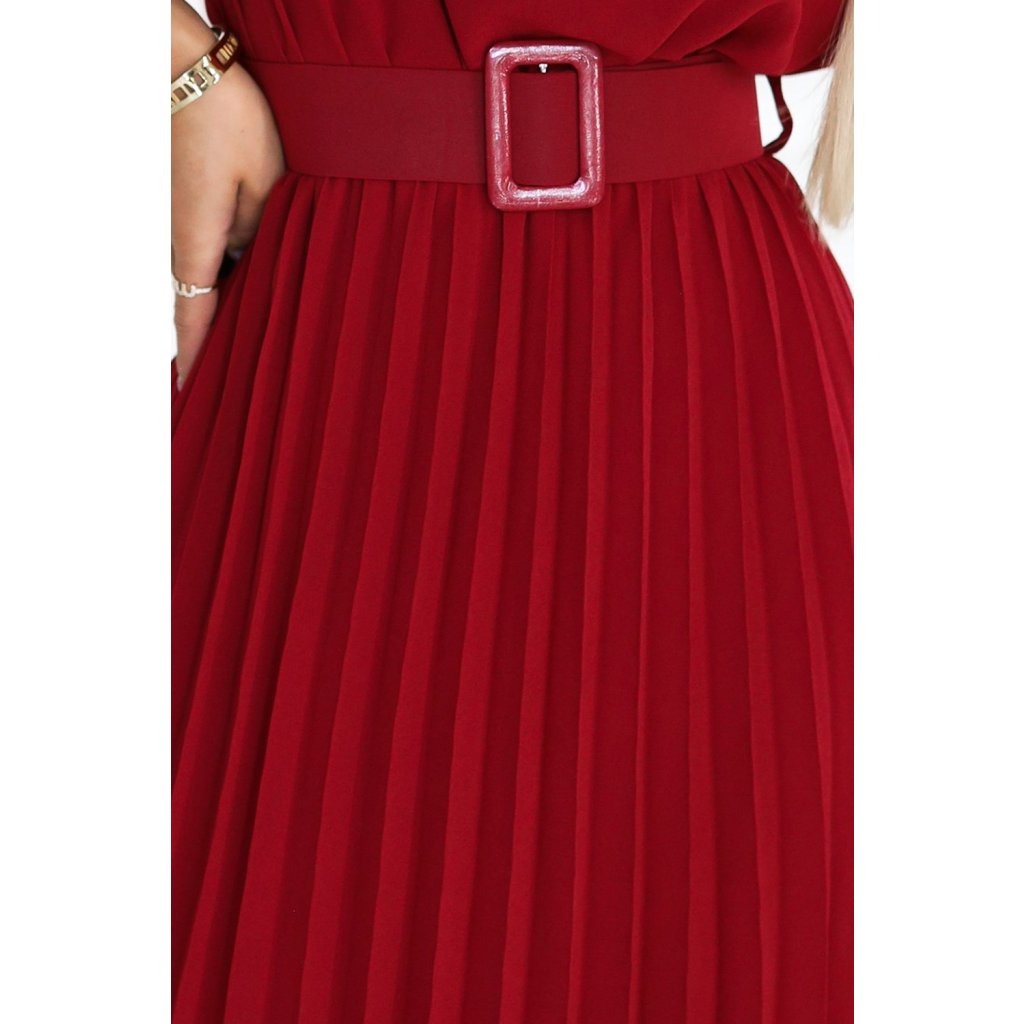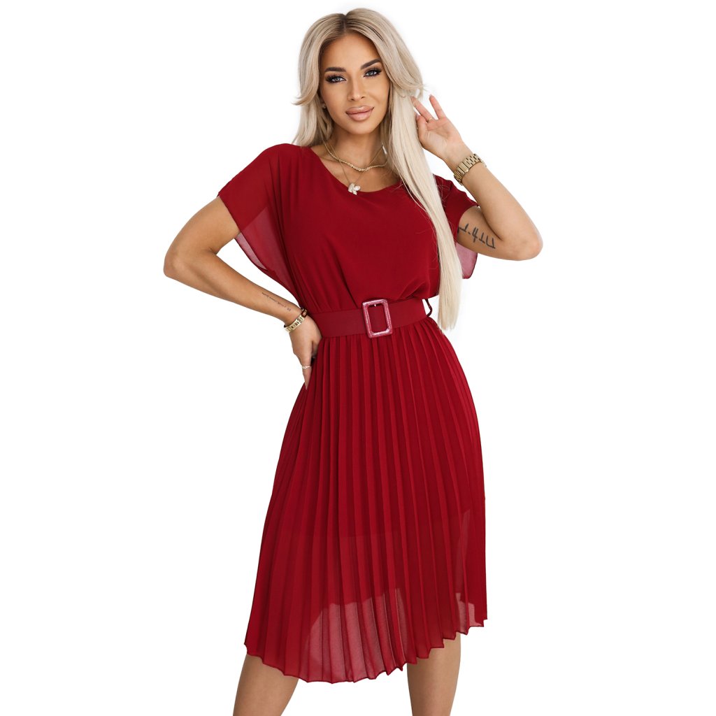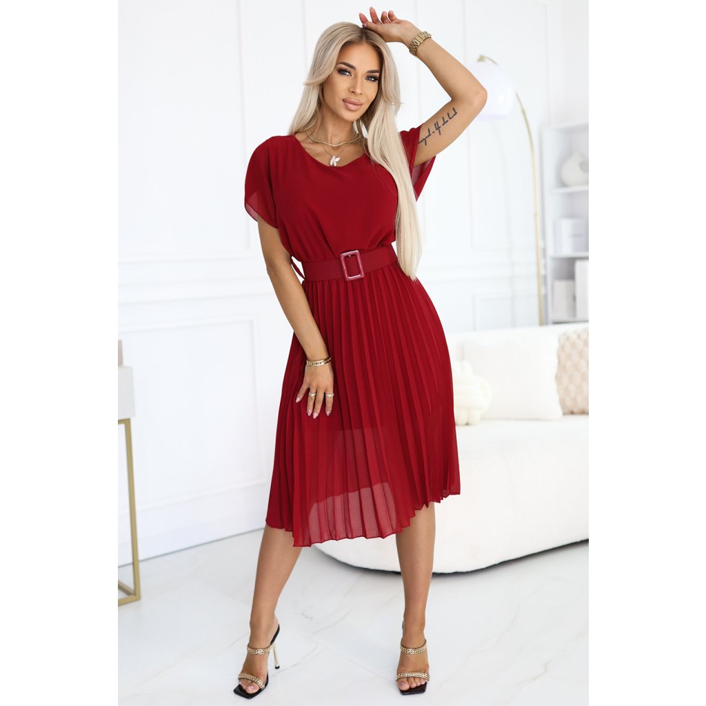 Elegantní plisované šaty s páskem – barva bordó – Numoco