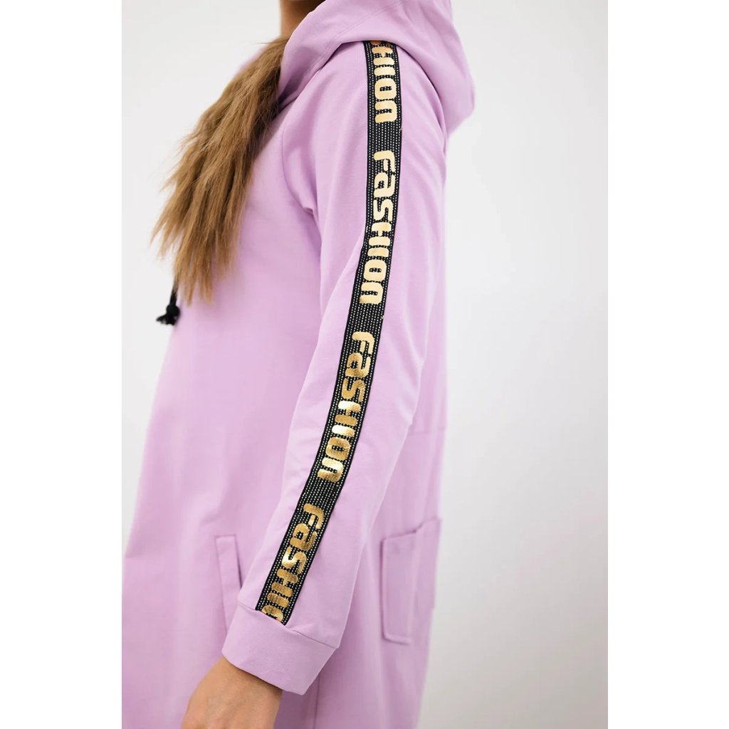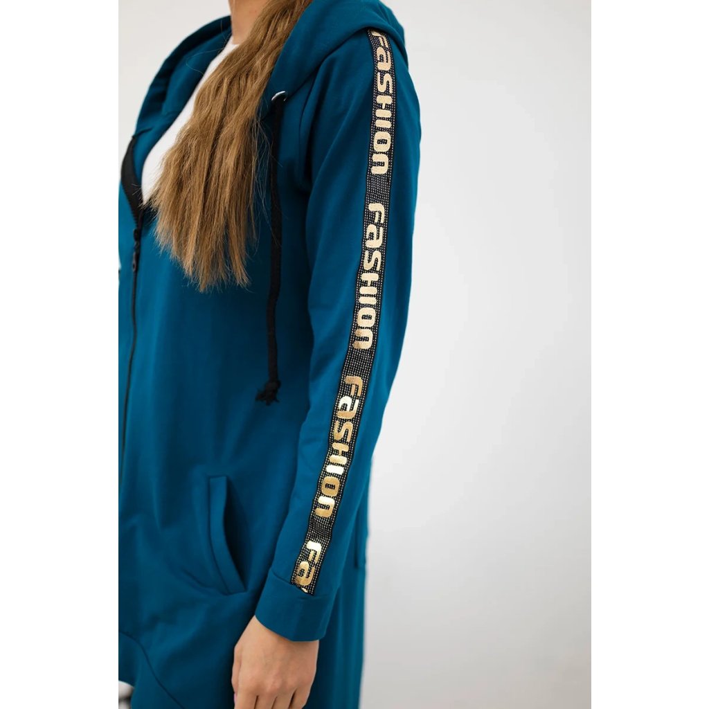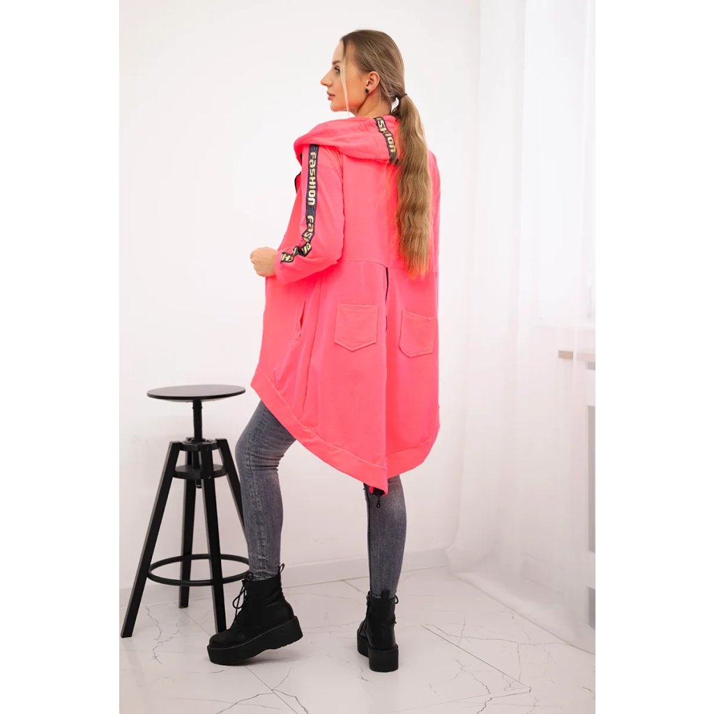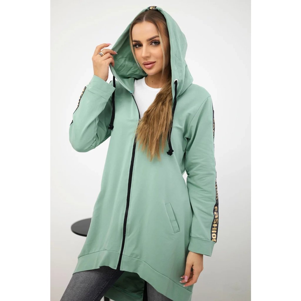 Představujeme vám pohodlnou dlouhou mikinu s kapucí. Mikina má zapínání na zip a další zip na zádech. Kapsy na bocích a dvě ozdoby na zadní straně. Mikina má našité stuhy s nápisem fashion. Mikina je vyrobena z vysoce kvalitního materiálu. Velikost je univerzální a vyhovuje dámám, které nosí velikost S, M nebo L.
