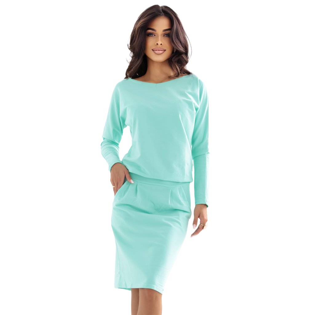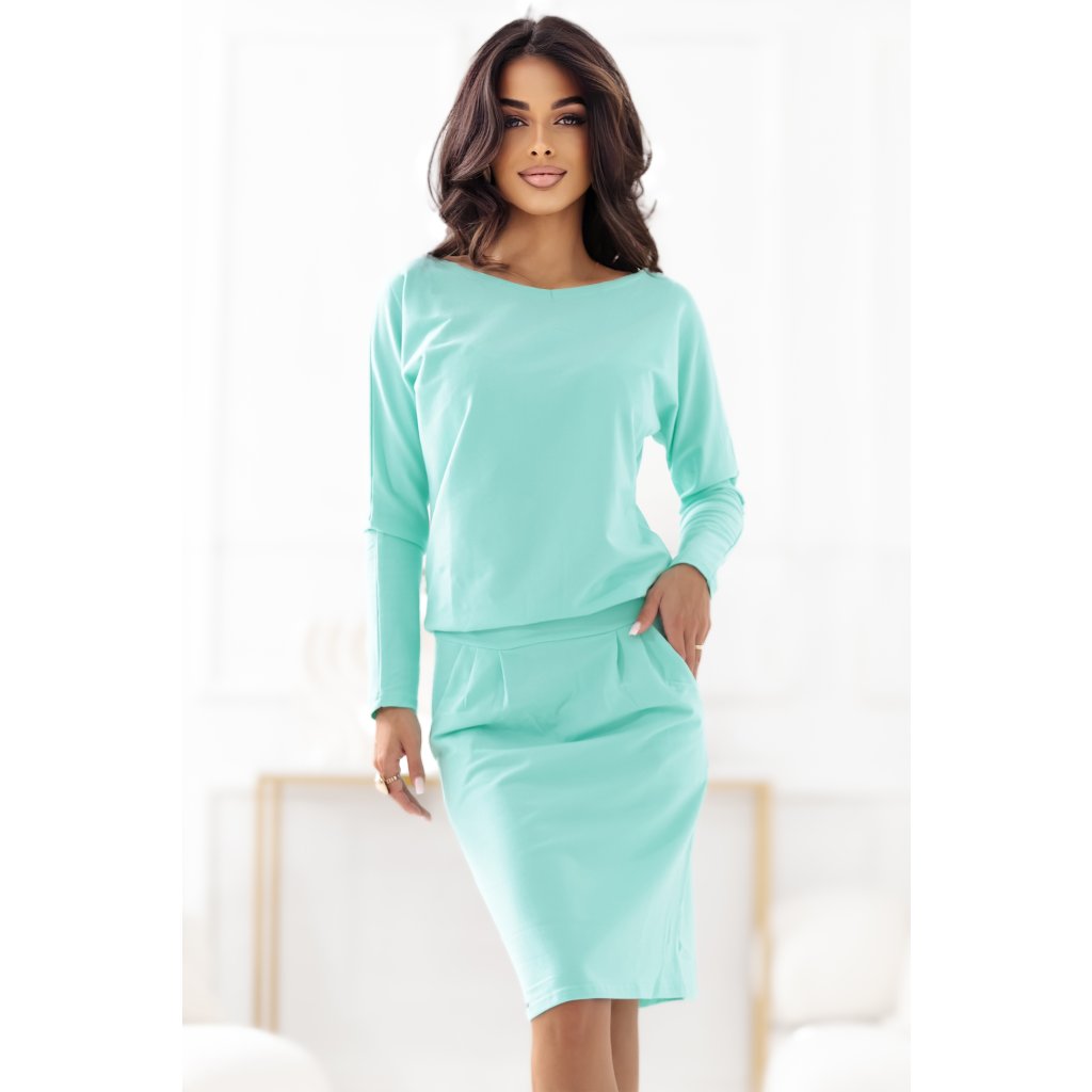 Pohodlné šaty v barvě mint s kapsami a volným zádem. Ideální pro každodenní nošení i do práce. Vyrobeno v Polsku – Numoco.