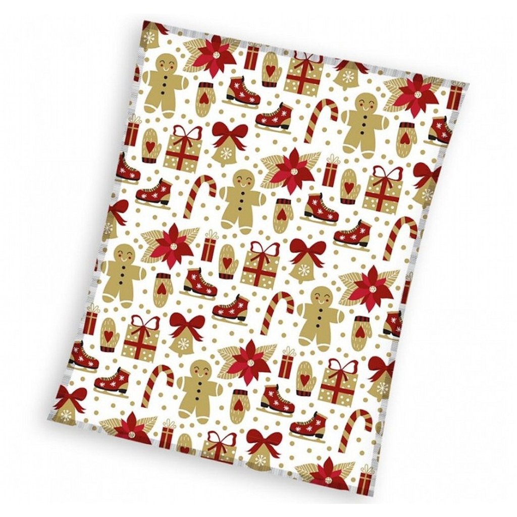 Mikroflanelová hřejivá deka s vánočním motivem je ideální volbou pro zimní období. Rozměr 150x200 cm poskytuje dostatek prostoru pro pohodlné zachumlání. Na bílém podkladu jsou rozesety dárečky s červenými stuhami, perníčci, vánoční punčochy, cukrové hůlky, zlaté tečky a červené květy poinsettie, které dodávají dece slavnostní a radostný vzhled.