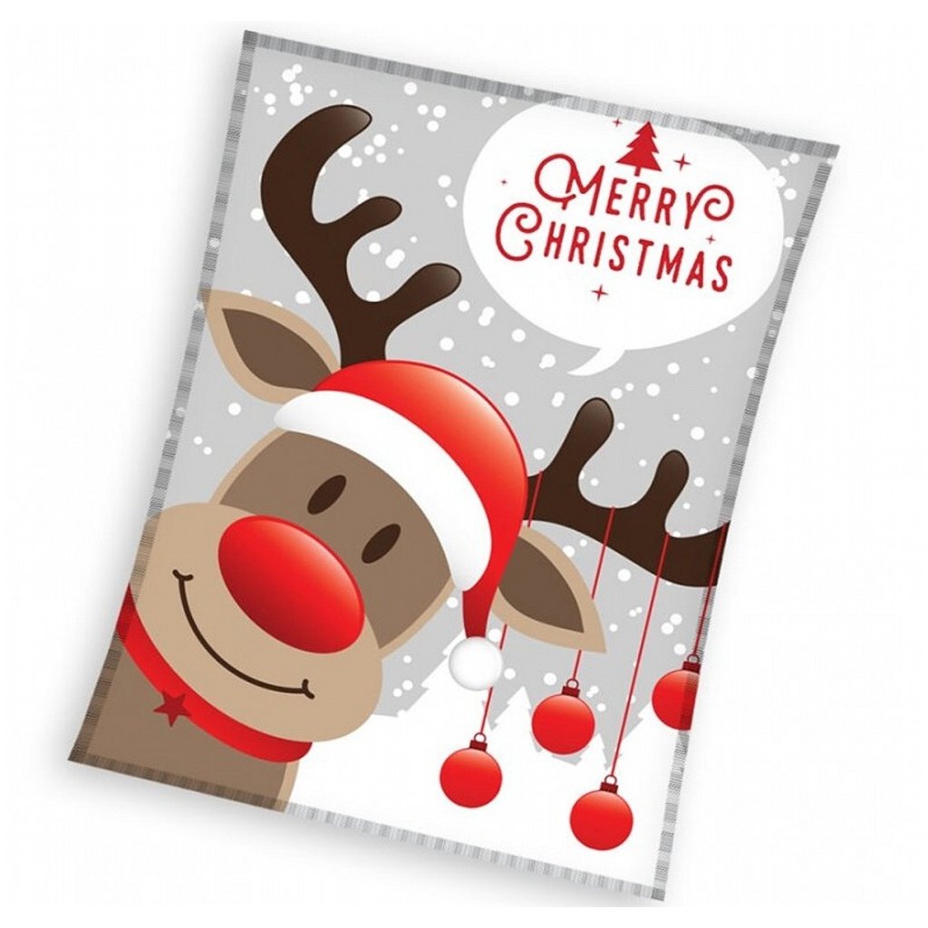 Mikroflanelová vánoční deka Sob Rudolf 150x200 cm je skvělým doplňkem pro zimní období. Na šedém podkladu se sněhovými vločkami je vyobrazen veselý sob Rudolf s červeným nosem a čepicí Santa Clause. Jeho parohy zdobí červené vánoční ozdoby a v horní části deky je nápis „Merry Christmas“ doplněný malým vánočním stromkem. Tento motiv rozzáří každý interiér a navodí tu pravou sváteční atmosféru.