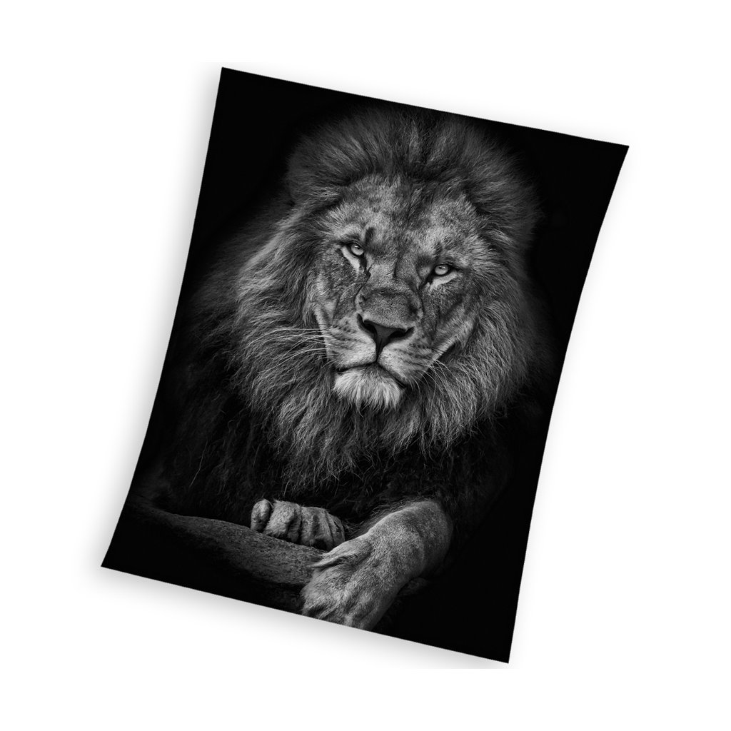 Mikroplyšová deka Lev Král Zvířat, je vyrobena ze 100% polyesteru, coral fleecu