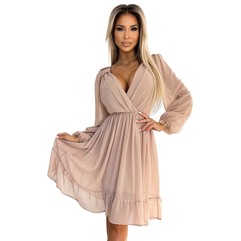 Mila - šifonové midi šaty s dlouhým rukávem a elegantně zakončeným výstřihem. Barva béžová. Celé šaty jsou šité s podšívkou. Značka numoco. Polská výroba.
