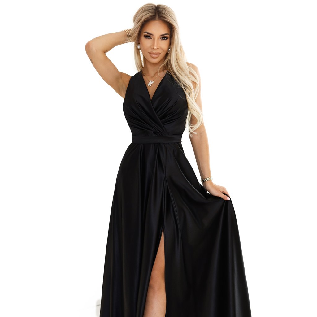 MONIQUE dlouhé exkluzivní saténové šaty s výstřihem a rozparkem na nohavicích - černé 587-2