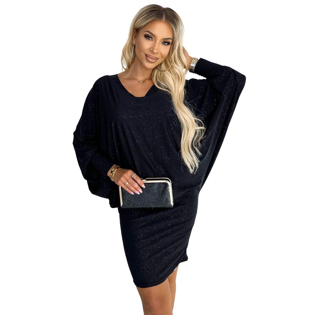 Netopýří šaty s výstřihem - Černá barva se třpytkami 402-5 - výprodej