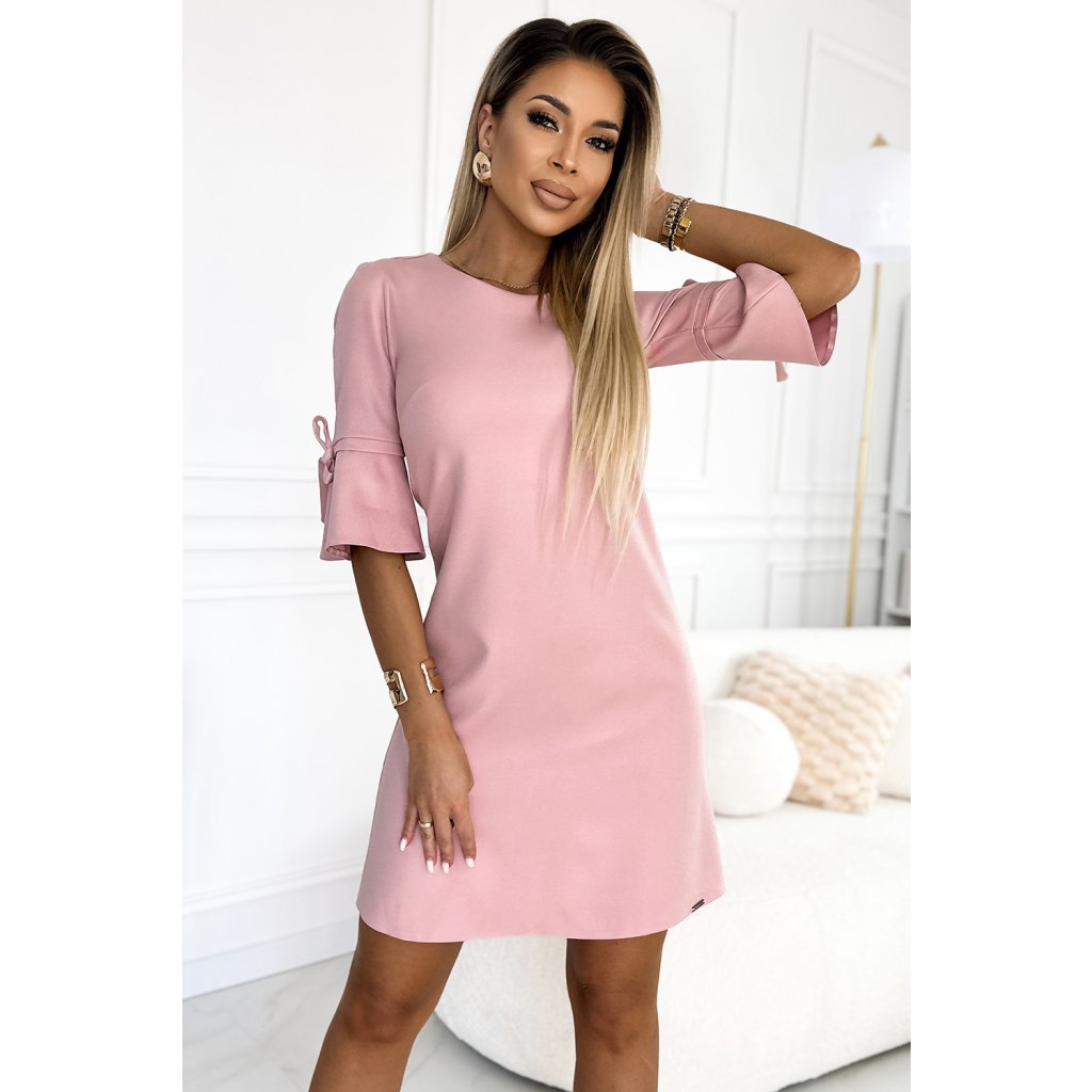 Neva - pohodlné trapézové šaty s rozšířenými rukávy a mašlemi - velmi ženské. Barva - pudrově růžová se třpytkami. Polský výrobek. Značka numoco.