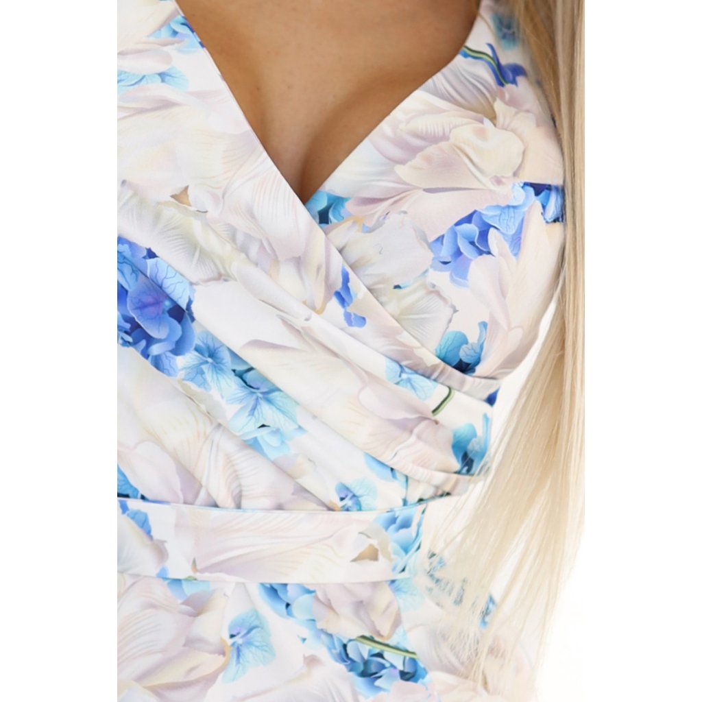 Květinové šaty se zavinovacím výstřihem, volány a páskem vzadu. Romantický vzor v pastelově modré a ecru. Pružný materiál, vypasovaný střih. Ideální pro jarní a letní příležitosti. Polská výroba – Numoco.