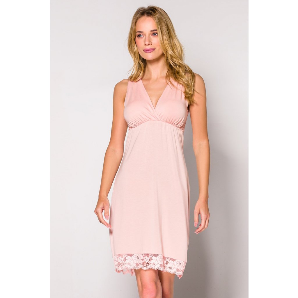Dámská noční košile dokonale přiléhá k tělu a zajišťuje nejvyšší komfort nošení. Výstřih zdobí krásné řasení a záda svůdný rozparek. Rozparky a spodní část košilky jsou zakončeny krajkou.