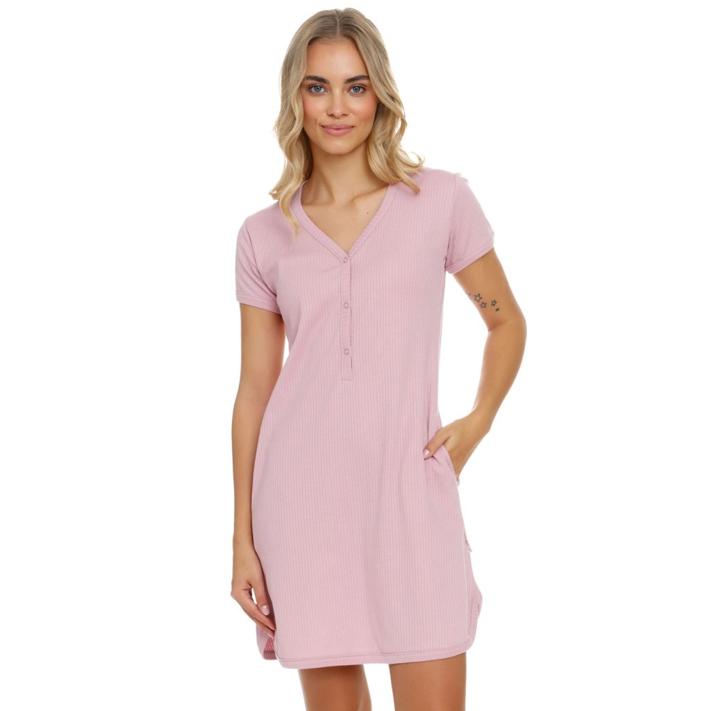 Noční košile s krátkými rukávy, ušitá z žebrované bavlny. Výstřih se zapínáním na patentku, ve tvaru srdce. Na úrovni boků, kapsy. Délka před kolenem. Složení: 100% bavlnaDoplňkové parametry