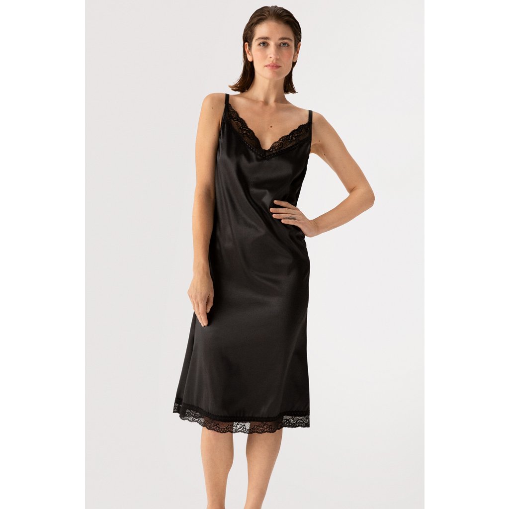 Elegantní saténová noční košilka v černé barvě.- Výstřih do V