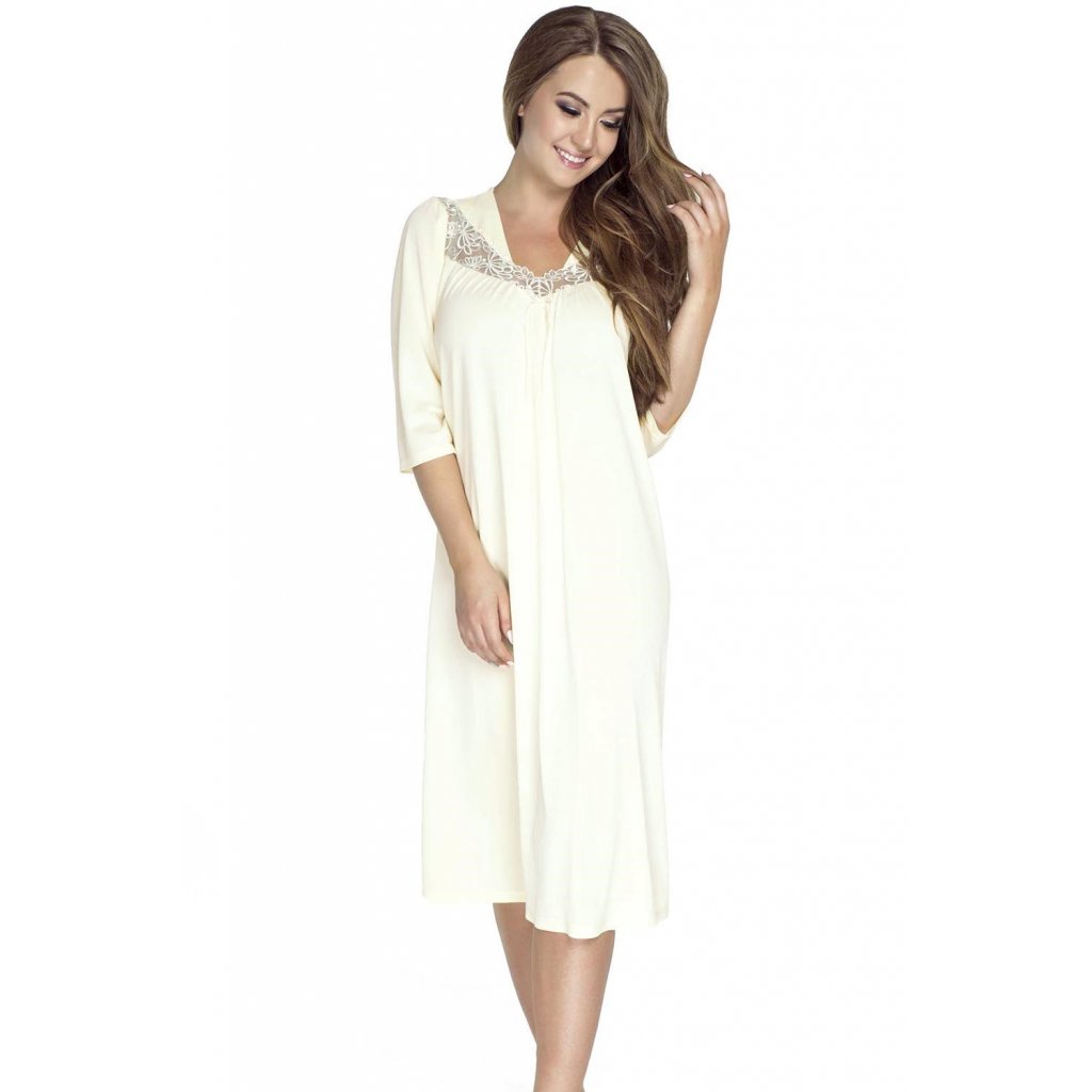 Elegantní noční košile s dlouhými rukávy 3/4 délky. Výstřih zdobený jemnou síťovinou s květinovou výšivkou, okouzlující luk a volánky. Tričko vyrobené z hedvábné viskózy.Složení: 72% viskóza, 28% polyamidDoplňkové parametry