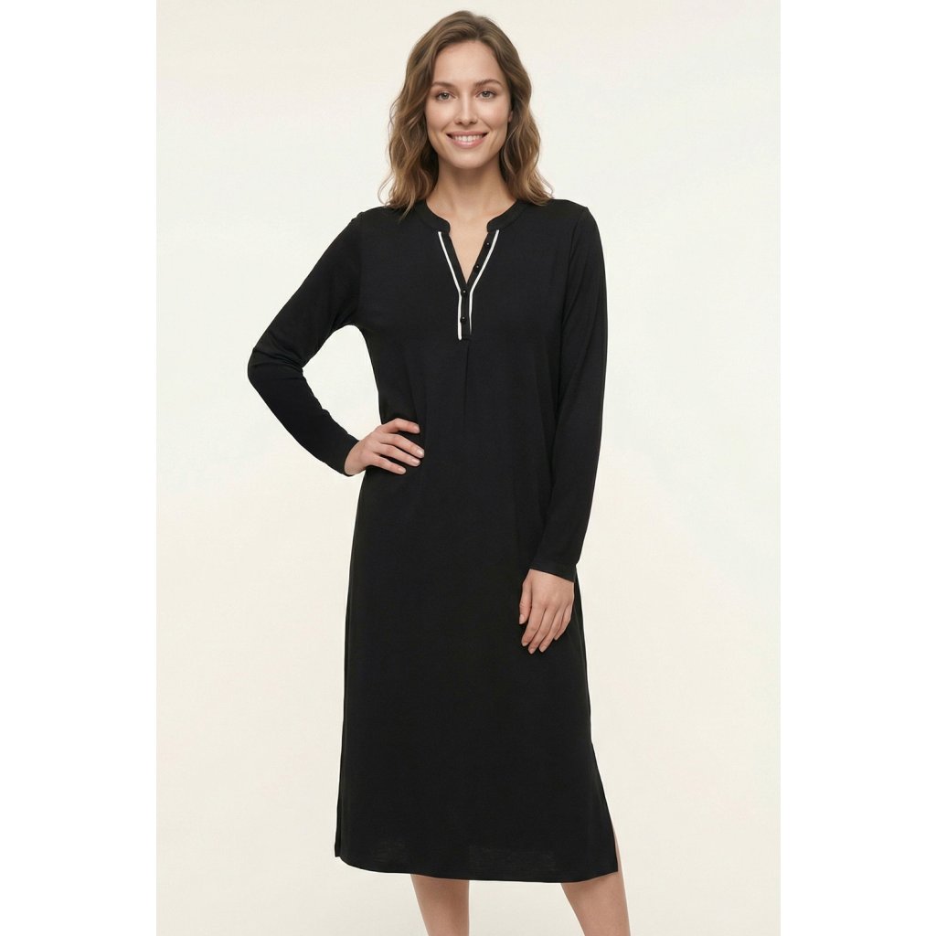 Noční košilka Vivisence 2062 kombinuje měkkost modalu s přirozeným pocitem bavlny a nabízí pohodlí, které oceníte hned od prvního oblékání. Hladká tkanina je hebká na dotek a jemná k pokožce a díky prodyšnosti je ideální pro celoroční nošení. Zapínání na knoflíky usnadňuje oblékání a umožňuje nastavení výstřihu dle potřeby. Dlouhé rukávy poskytují extra krytí za chladnějších večerů. Délka 7/8 poskytuje pocit volnosti a zároveň dobré krytí. Klasický, rovný střih kopíruje tělo a umožňuje neomezený pohyb během spánku a volného času doma. Pečlivě prošité okraje a jemná úprava zdůrazňují kvalitu řemeslného zpracování. Jedná se o praktickou volbu pro každodenní nošení – na spaní, relaxaci i lenošná rána.Měkký, k pokožce šetrný úplet z modalu a bavlny.