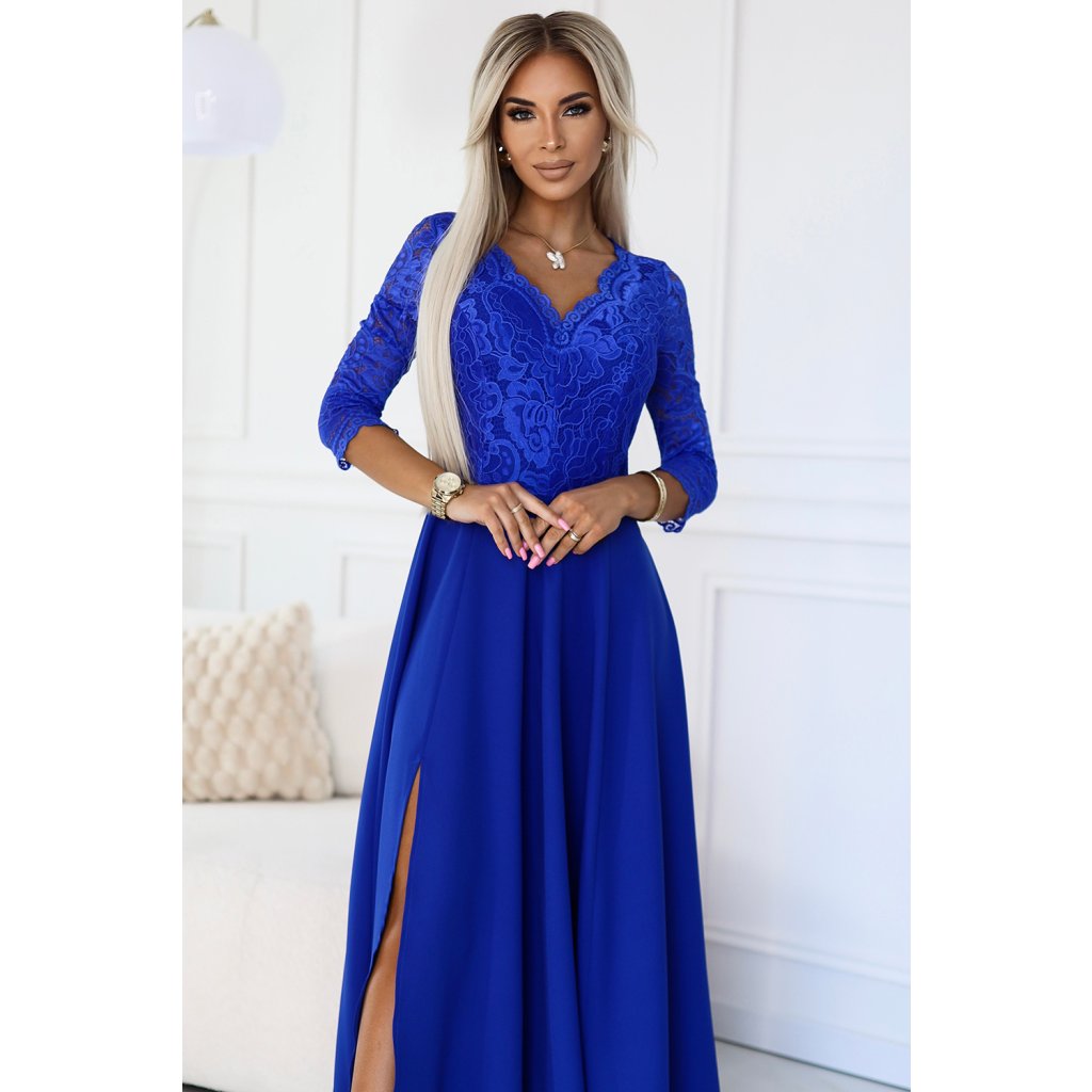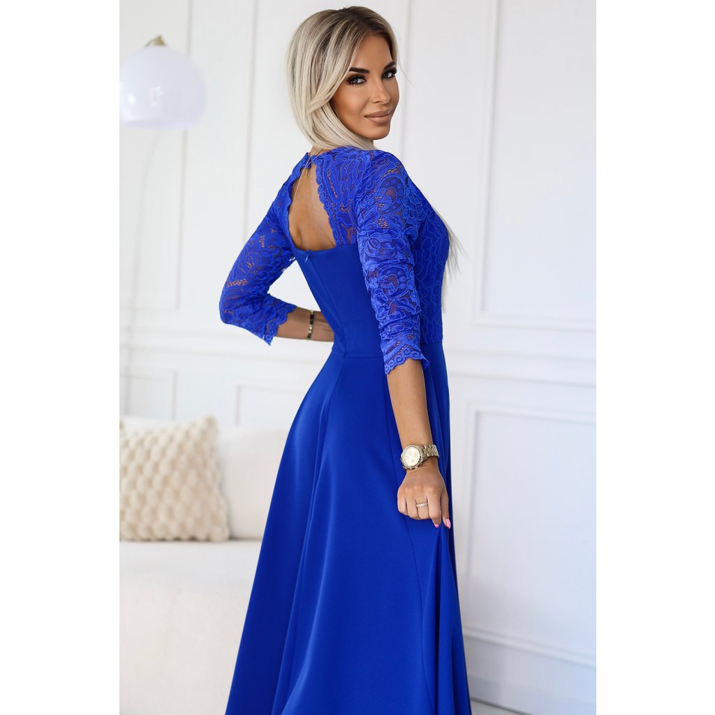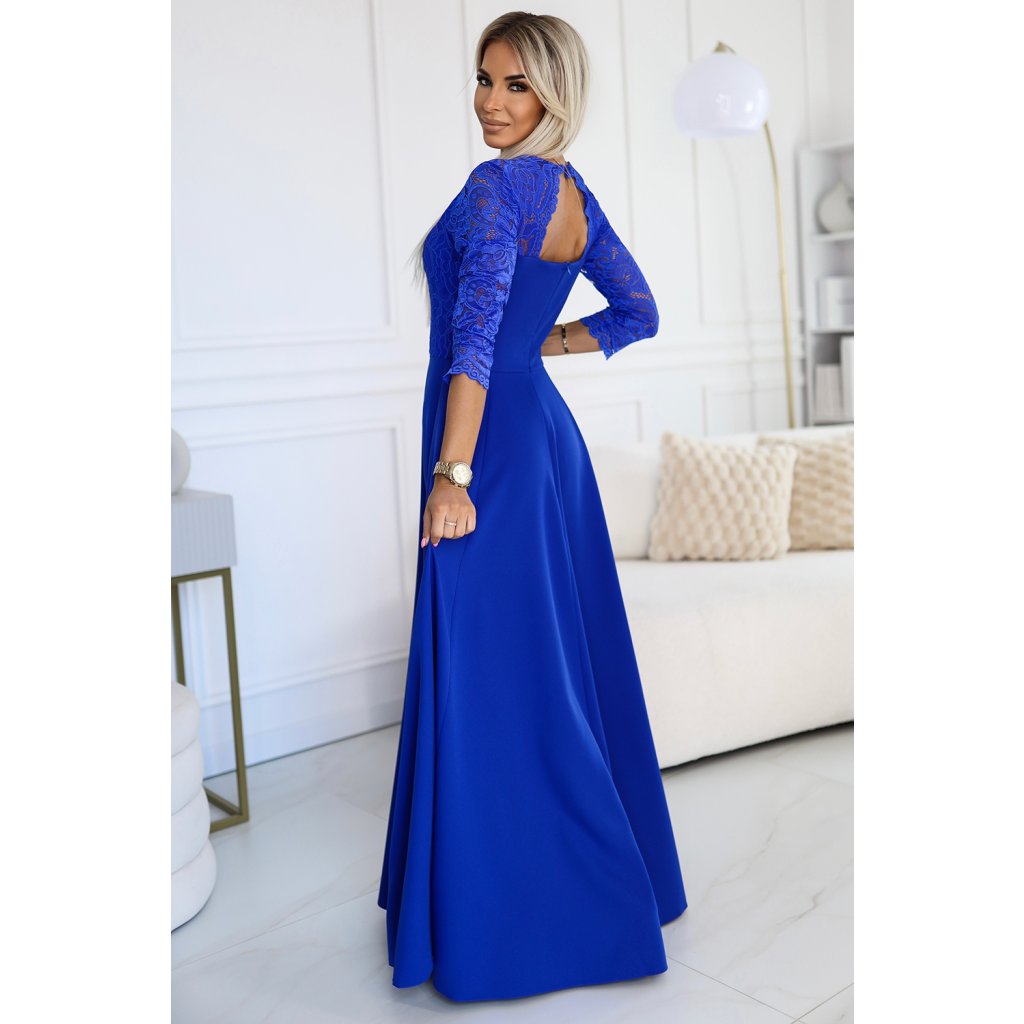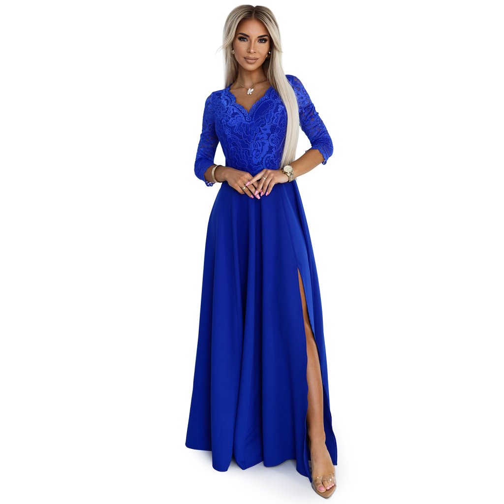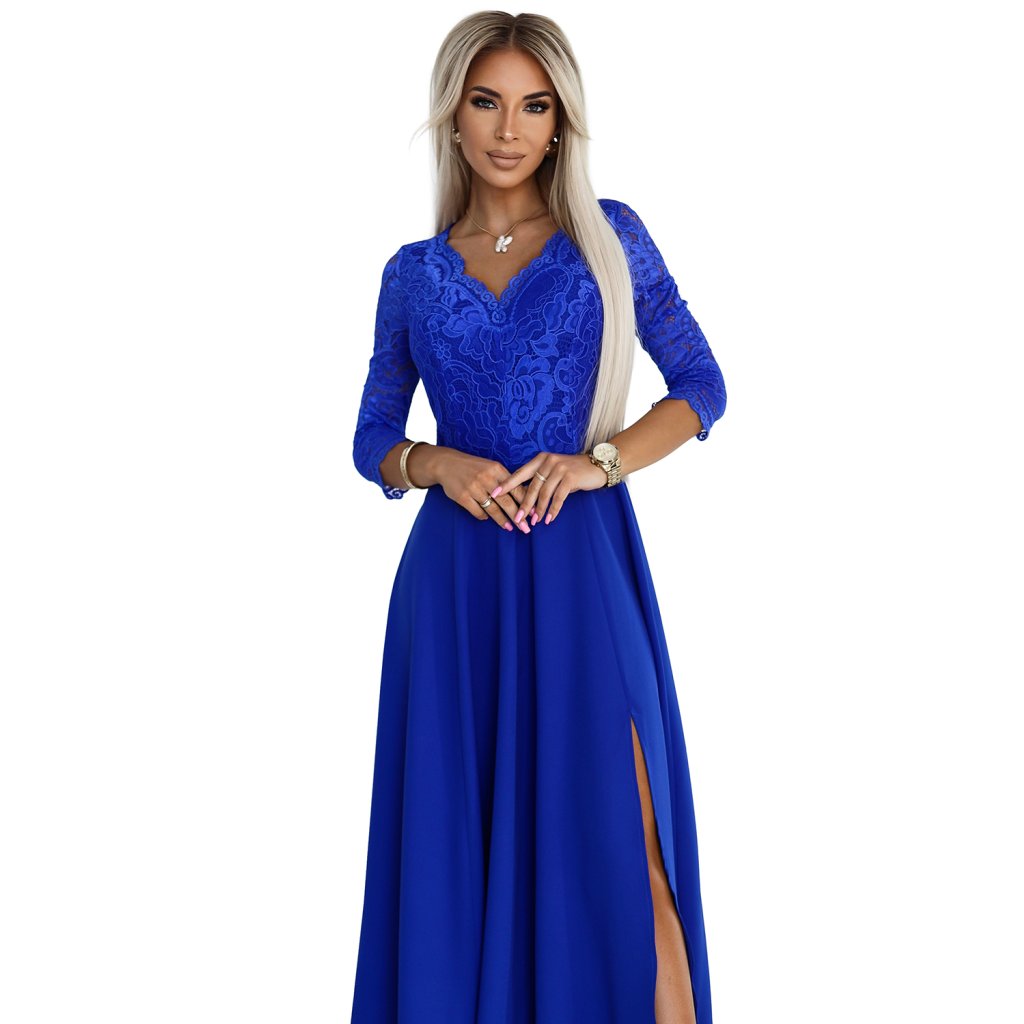 Numoco AMBER elegantní krajkové dlouhé šaty s výstřihem - modré 309-12