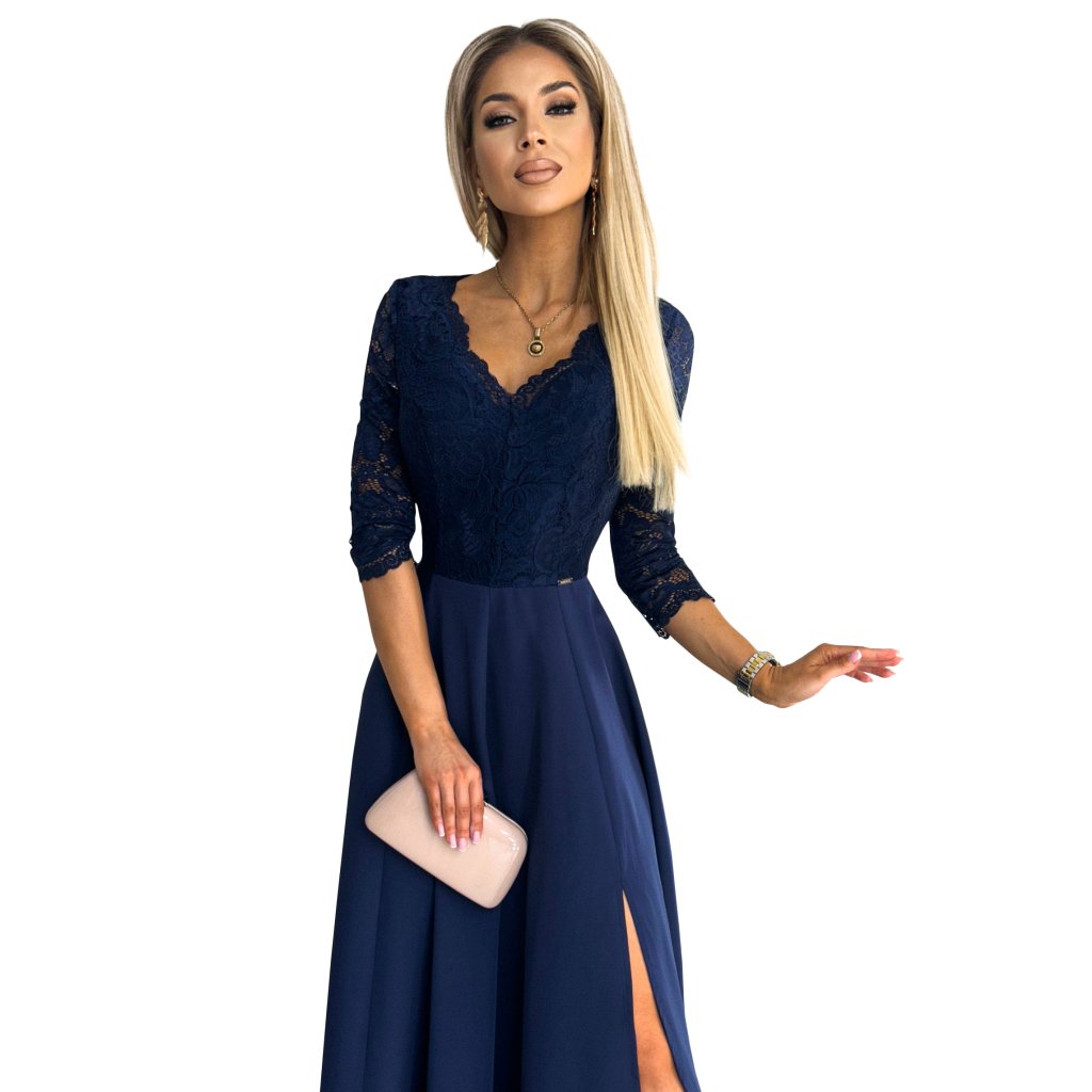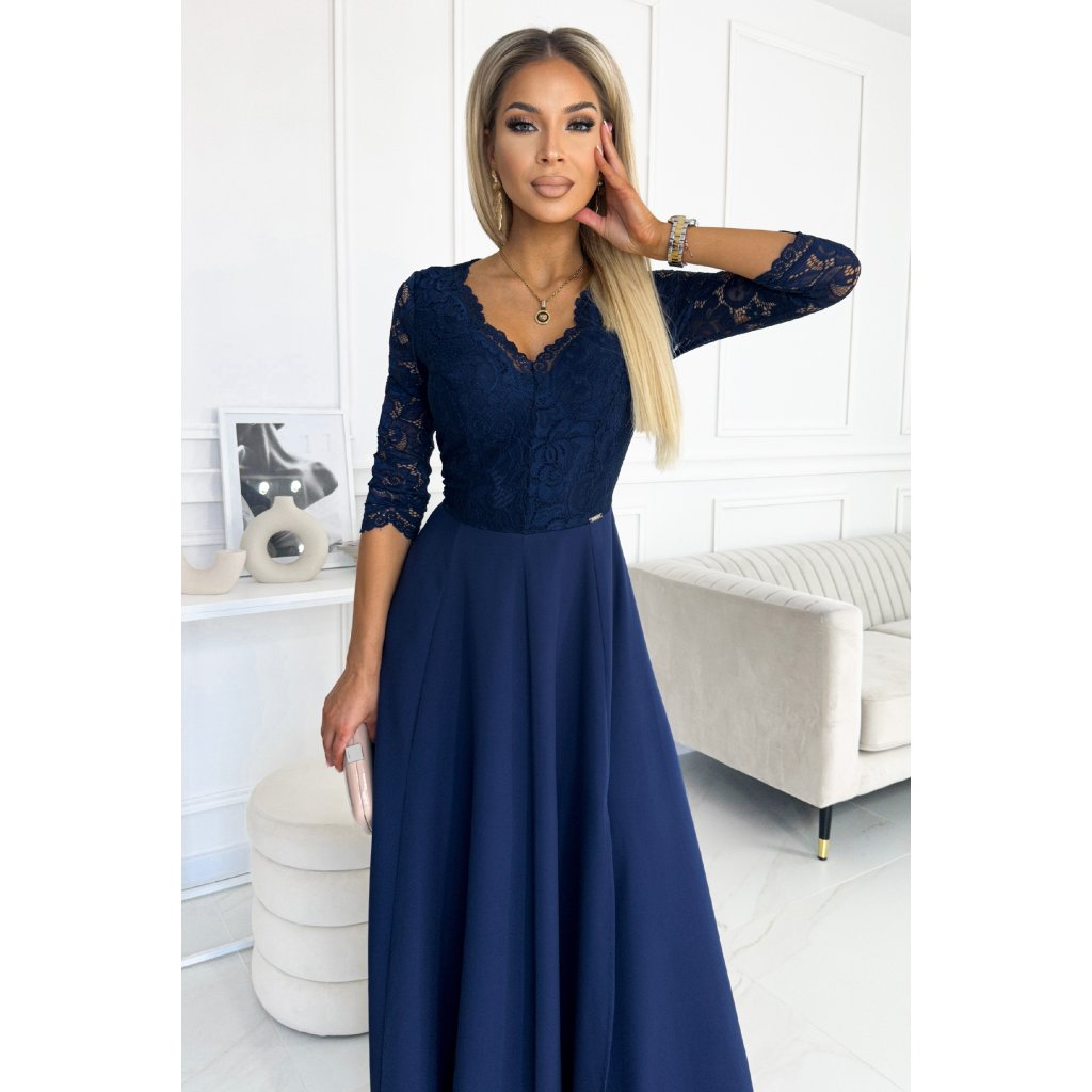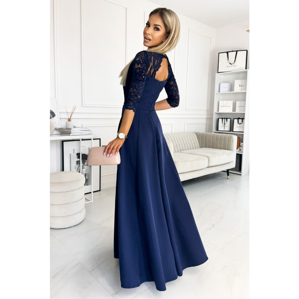 Numoco AMBER elegantní krajkové dlouhé šaty s výstřihem - tmavě modrá 309-6