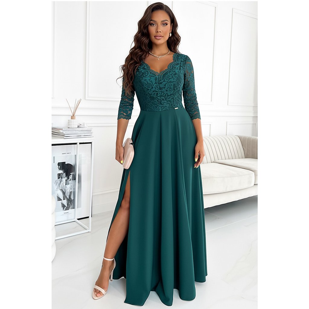Numoco AMBER elegantní krajkové dlouhé šaty s výstřihem - zelené 309-5