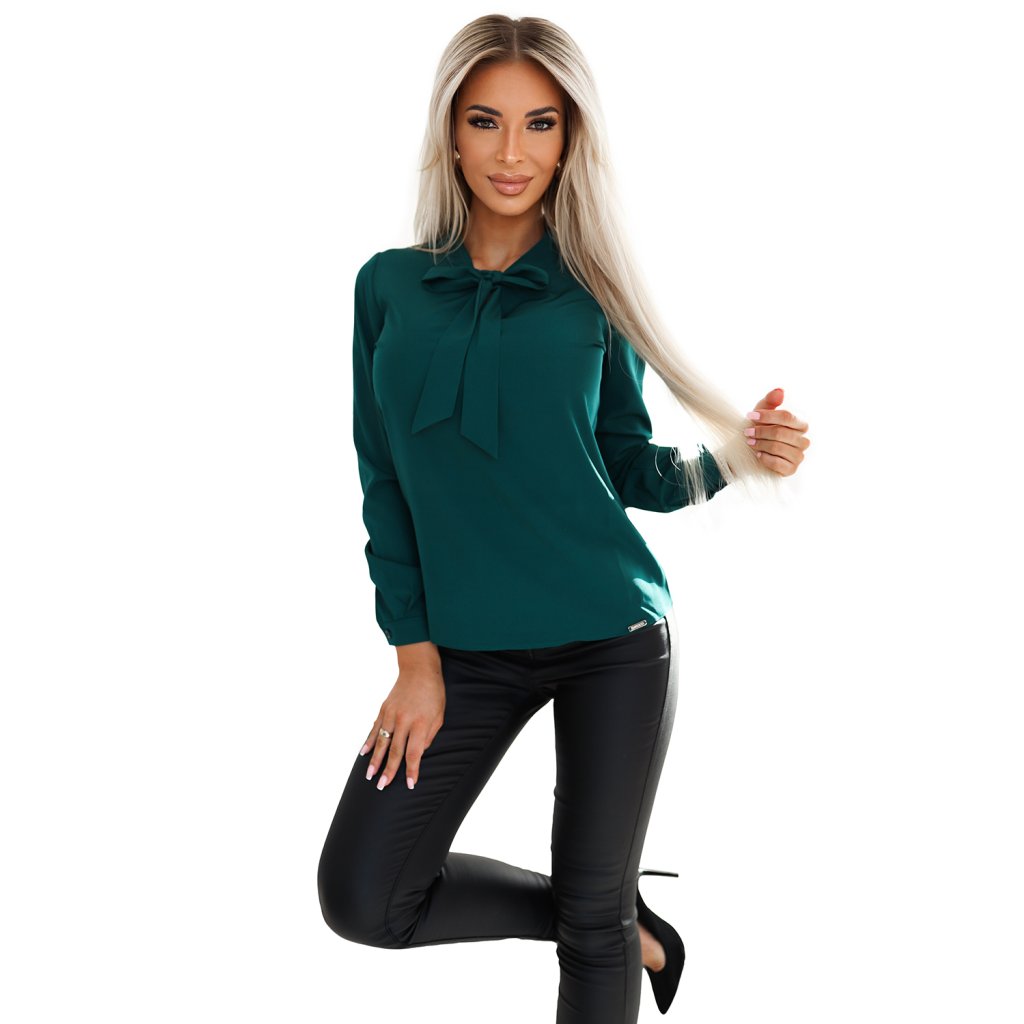 Business halenka Numoco je kombinací klasické a moderní elegance. Vyrobeno z měkkého, na dotek příjemného materiálu v krásné zelené barvě, vyniká stylovým zavazováním u výstřihu, které mu dodává ženský půvab. Dlouhé rukávy zakončené subtilními manžetami zdůrazňují formální charakter halenky, díky čemuž je ideální volbou do kanceláře, na obchodní jednání nebo elegantní příležitosti. Polský výrobek, který zaručuje vynikající zpracování a preciznost v každém detailu.