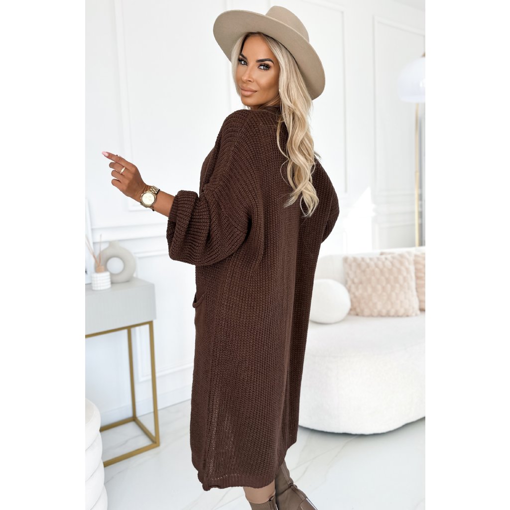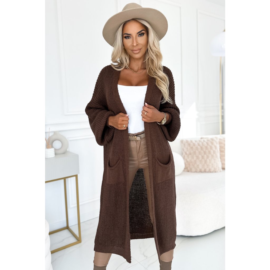 Numoco Cardigan - dlouhý svetrový plášť s kapsami - čokoládová barva 627-2