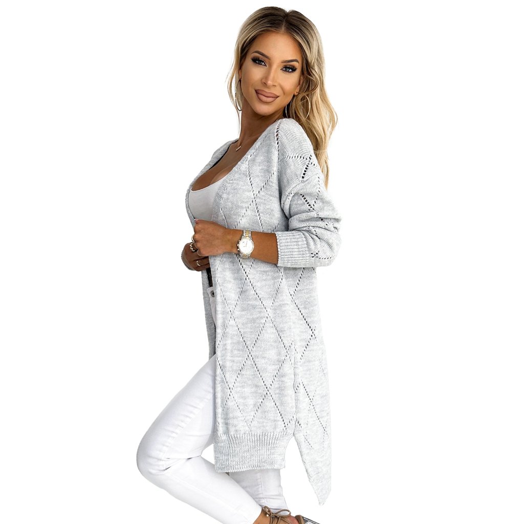 Cardigan - teplý svetrový kabát s delším zadním dílem. Vyrobeno ze svetrového materiálu s prolamovanými diamanty - šedá barva. Značka Numoco. evropská produkce.