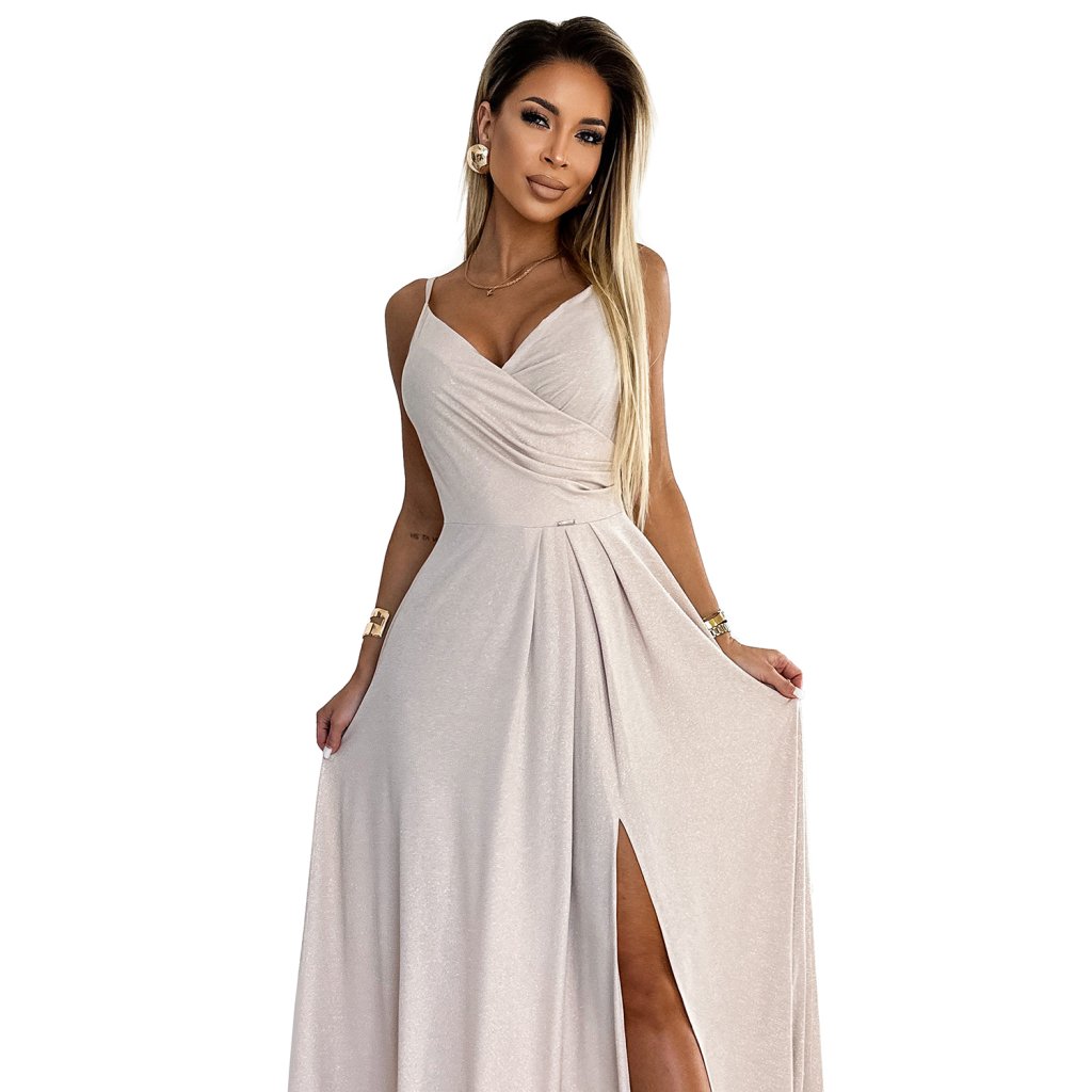 Chiara - elegantní maxi dlouhé lesklé šaty na ramínka. Krásně tvarovaný výstřih a rozparek na sukni vytvářejí neobvyklou kompozici. Vyrobeno ze třpytivého, elastického béžového materiálu. Šaty ideální na svatby, Silvestra, ples, karneval a další významné příležitosti. Polská výroba. Značka Numoco.