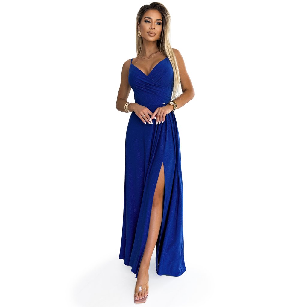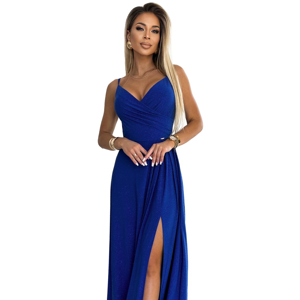 Chiara - elegantní maxi dlouhé lesklé šaty na ramínka. Krásně tvarovaný výstřih a rozparek na sukni vytvářejí neobvyklou kompozici. Vyrobeno ze třpytivého, elastického modrého materiálu. Šaty ideální na svatby, Silvestra, ples, karneval a další významné příležitosti. Polská výroba. Značka Numoco.