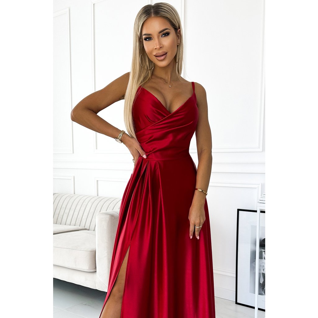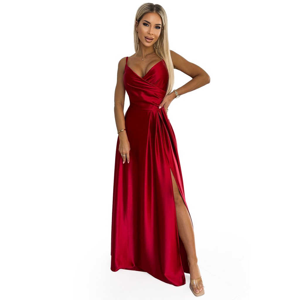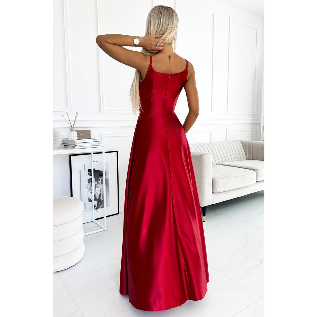 Numoco CHIARA elegantní saténové maxi šaty na ramínka - Červené 299-14