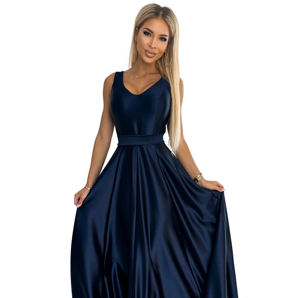 Numoco CINDY dlouhé saténové šaty s výstřihem a mašlí - tmavě modré 508-1