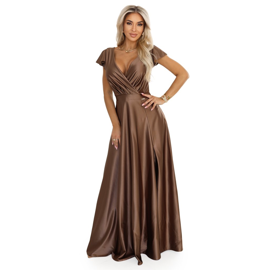 Numoco CRYSTAL saténové dlouhé šaty s výstřihem - mocha mousse 411-14
